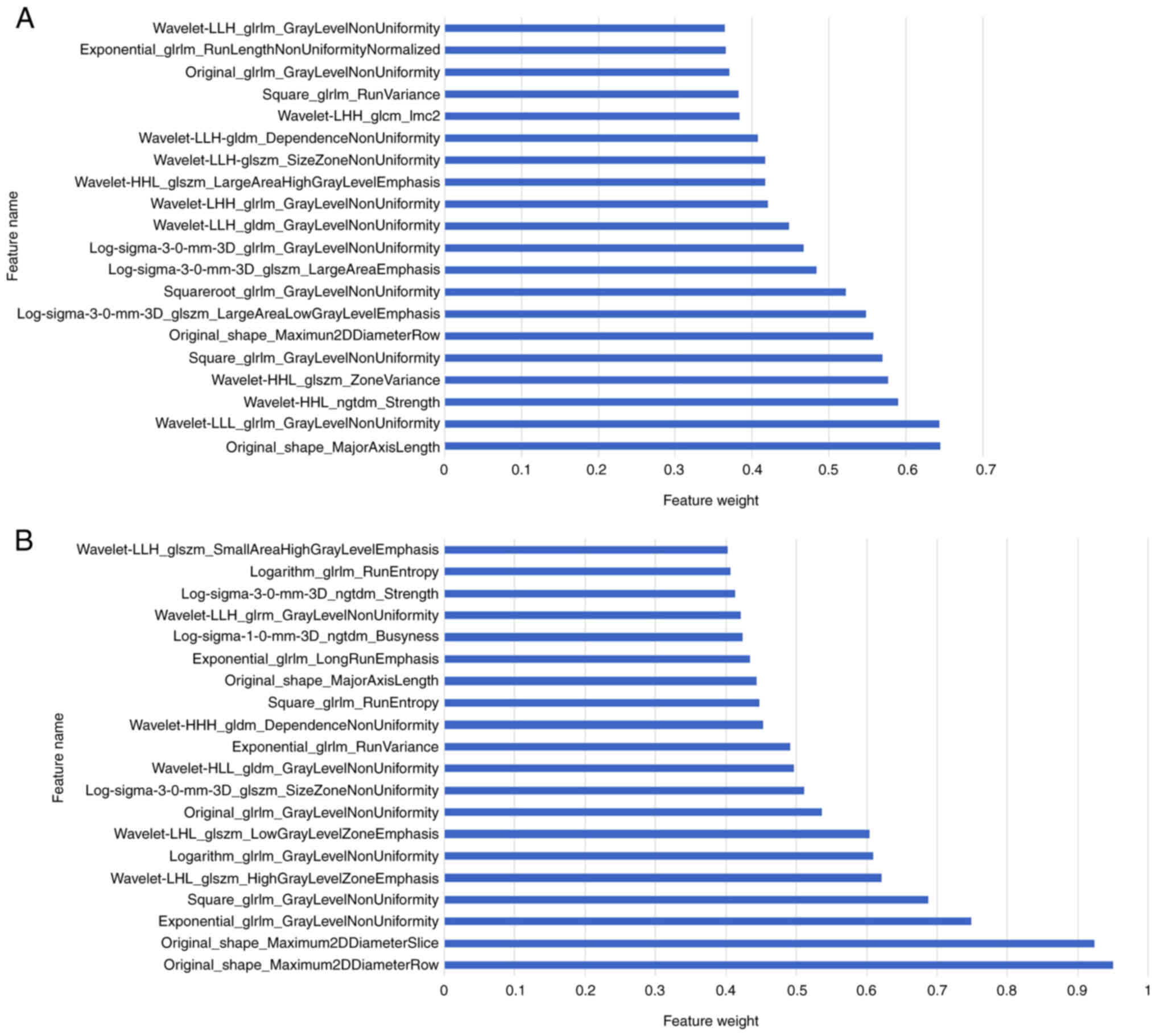 Radiomic features were extracted from the delineated VOIs. Using an ICC threshold of >0.75 as a reliability standard, a total of 1,259 stable radiomic features were retained from the intratumoral VOI, whilst 1,331 stable features were retained from the combined intratumoral and peritumoral VOI. Subsequently, the MT-RF and RF algorithms were employed for feature selection and model construction. The MT-RF algorithm generated a feature importance score for each task, which was then aggregated to provide a comprehensive assessment of feature importance across all tasks. Similarly, the RF algorithm generated a feature importance score to all retained features. The features were ranked from highest to lowest importance. Figs. 3 and 4 present histograms of the top 20 most important radiomic features used in model development by the RF and MT-RF algorithms, respectively.