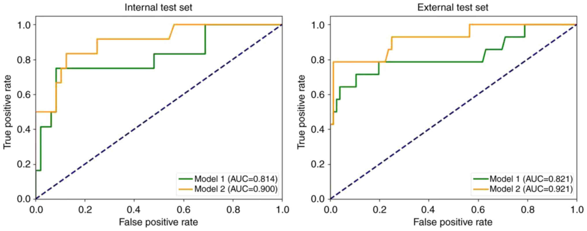 Table II and Fig. 5 demonstrate the performance of the single-task models on both the internal and external test sets in the present study. The results revealed that model 1 achieved an AUC of 0.814 and 0.821 for the internal and external test sets, whilst model 2 achieved an AUC of 0.900 and 0.921 for the internal and external test sets, respectively.