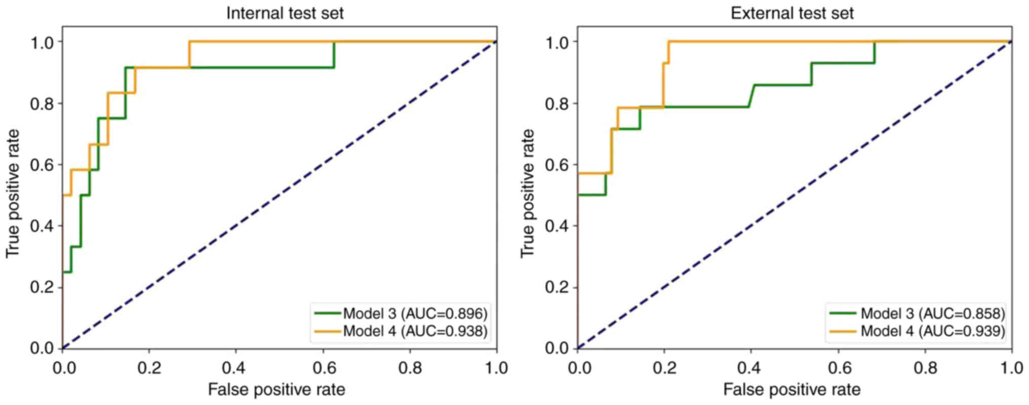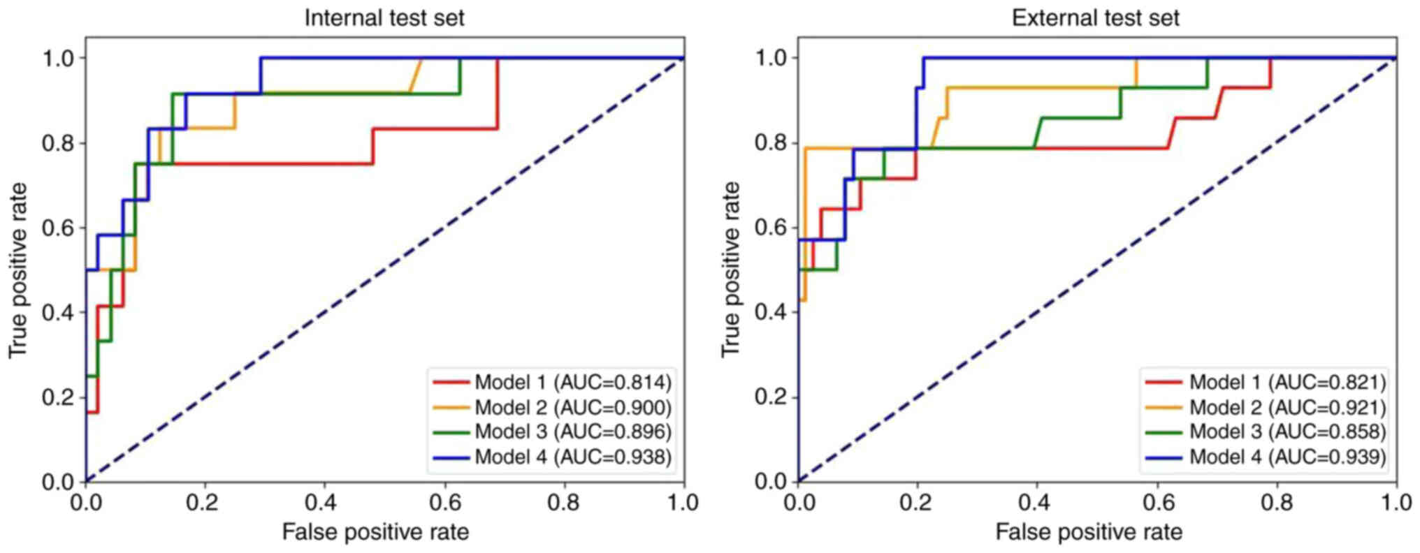 The results of the DeLong test for the four models are presented in Table IV. The findings indicated that the AUC of models 1 and 4 were significantly different in both the internal test set (P=0.049) and the external test set (P=0.046).