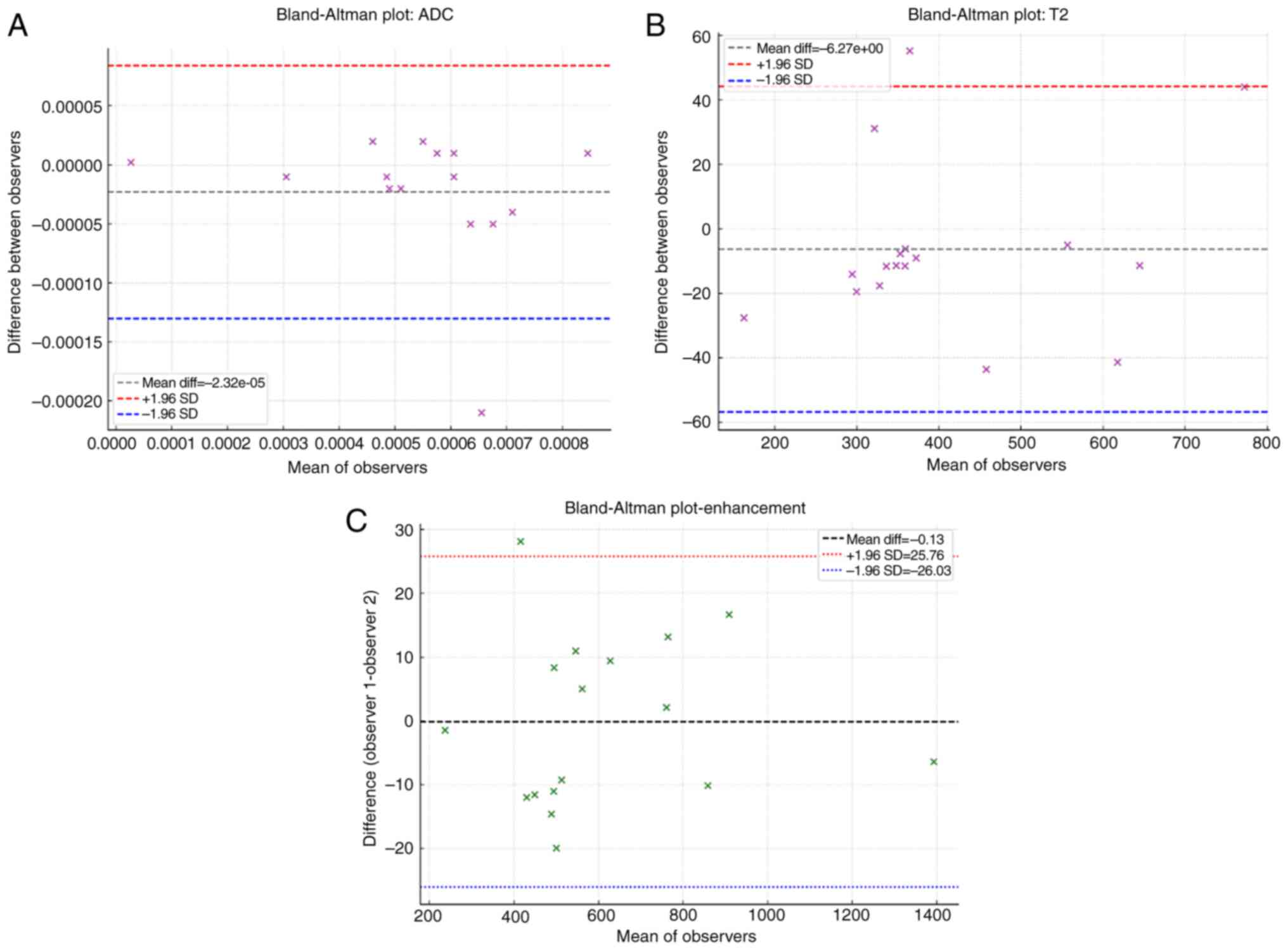 All images were available in digital format. Image analysis was performed on a Philips Portal Viewer. T2 and ADC maps were co-registered with the post-contrast T1-weighted 3D-gradient echo sequence. Image analysis was conducted by two independent neuroradiologists, who drew a circular Region-of-Interest (ROI) within the tumor, avoiding regions suspected of intralesional hemorrhage or necrosis. Three sets of data were collected, including ADC, T2 signal, and enhancement evaluation. A Bland-Altman plot was used to assess agreement between the two observers (Fig. 1). Good inter-observer agreement was demonstrated for all MRI parameters: ADC (Fig. 1A), T2 signal (Fig. 1B), and enhancement (Fig. 1C).
