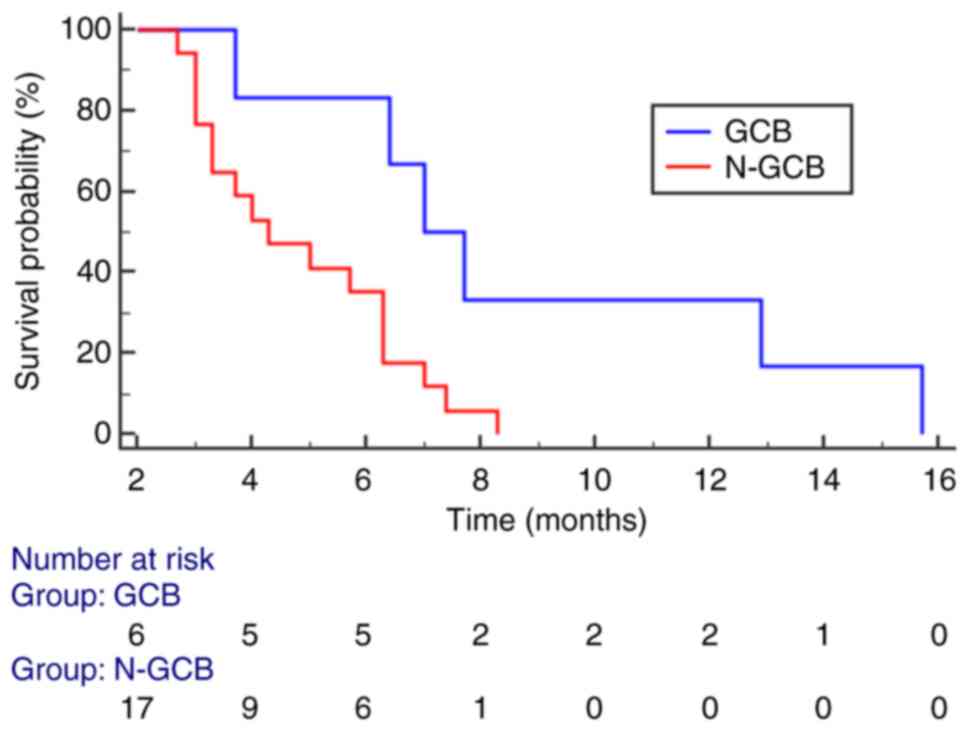 Table I.Clinical and pathological characteristics of patients with primitive diffuse large B-cell lymphoma. |