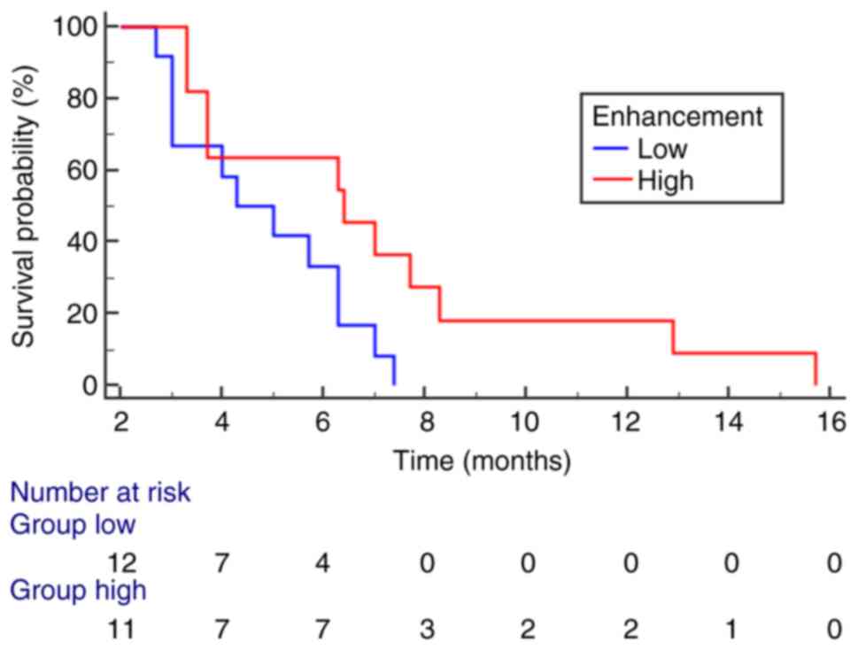 Univariate analysis revealed significant statistical associations between the following variables: site of disease and number of lesions (P=0.04), site of disease and immunohistochemical (IHC) subtype (P=0.03), gender and ADC (P=0.02), and IHC subtype and mean value of enhancement (P=0.008) (Table II, Table III, Table IV, Table V). In multivariate analysis, IHC subtype (P=0.0158) (Fig. 5) and mean value of enhancement (P=0.0391) (Fig. 6) emerged as independent variables; comparing survival curves for GCB vs. Non-GCB and low vs. high enhancement revealed significant differences in OS. Additionally, a trend toward statistical significance was observed for c-Myc (P=0.0648).