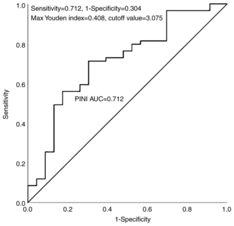 Statistical analyses were performed using SPSS software (v25.0; IBM Corp.). The predictive performance of PINI for patient outcomes was evaluated through receiver operating characteristic (ROC) curve analysis, with the area under the curve (AUC) calculated to determine the optimal cutoff value using the Youden index. Based on this cutoff, patients were stratified into high-PINI and low-PINI groups for subsequent comparative analyses of clinicopathological characteristics. Continuous variables with normal distribution are expressed as the mean ± standard deviation and compared using independent samples t-tests, while non-normally distributed continuous variables are presented as median (Q1-Q3) and were analyzed using the Mann-Whitney U test. Categorical variables are reported as n (%) and compared using either the χ2 test or Fisher's exact test. P<0.05 was considered to indicate a statistically significant difference. Univariate and multivariate Cox proportional hazards regression models were employed to estimate hazard ratios (HRs) and 95% confidence intervals (CIs) for RFS and OS. Variables demonstrating statistical significance (P<0.05) in univariate analysis were included in the multivariate model. Survival probabilities for RFS and OS were estimated using the Kaplan-Meier method, with between-group differences assessed by log-rank tests.