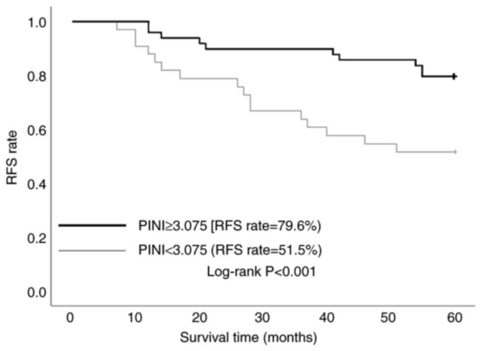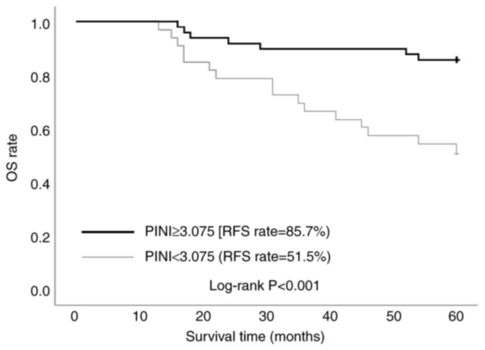 ROC curve analysis identified an optimal PINI cutoff value of 3.075 (AUC, 0.712), demonstrating moderate predictive accuracy with 71.2% sensitivity and 69.6% specificity (Fig. 1). A total of 82 patients (aged 39–85 years) were divided into the low-PINI group (n=33; 40.2%) and the high-PINI group (n=49; 59.8%). Figs. 2 and 3 present the Kaplan-Meier analysis of RFS and OS stratified by PINI values. In Fig. 2, the 5-year RFS rate was significantly higher in the high-PINI group (PINI ≥3.075) at 79.6% compared with 51.5% in the low-PINI group (PINI<3.075) (log-rank P<0.001). Similarly, in Fig. 3, a higher 5-year OS rate was demonstrated in the high-PINI group (85.7%) compared with that in the low-PINI group (51.5%) (log-rank P<0.001). These findings consistently indicate that elevated PINI levels are strongly associated with improved long-term survival outcomes, underscoring its potential as a significant prognostic biomarker in GC.