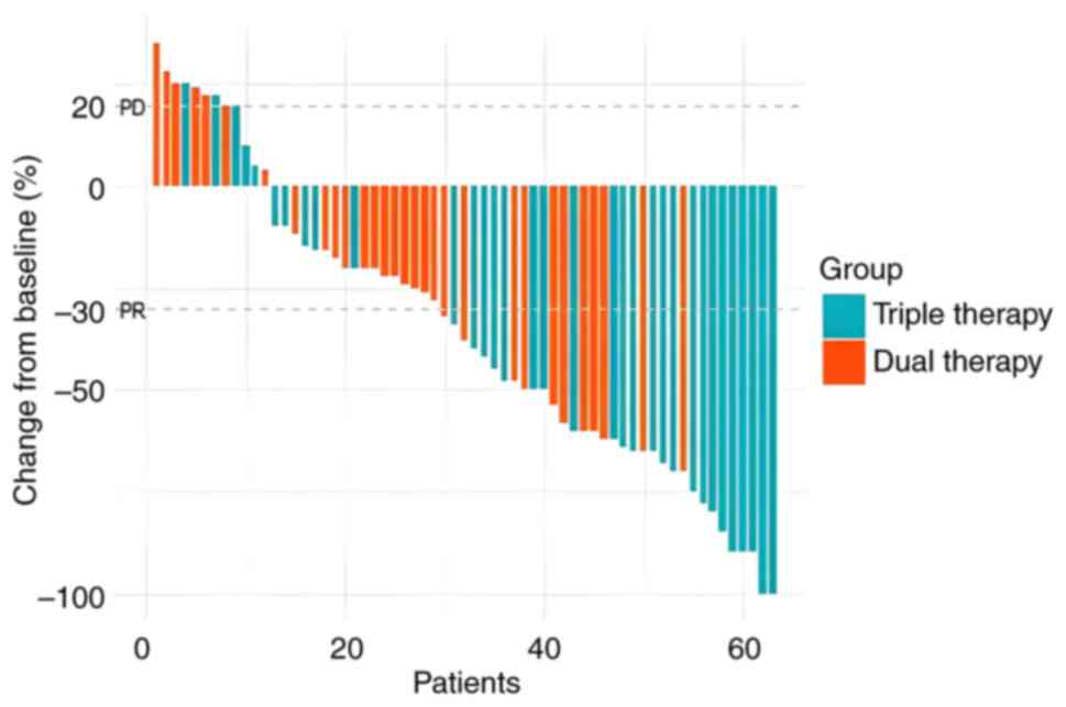 The evaluation of tumor response was performed according to mRECIST, specifically by measuring the maximum diameter of the enhancing region in each lesion (22). In the HAIC combined with targeted immunotherapy group, the CR, PR, SD and PD rates were 2 (6.1%), 21 (63.6%), 7 (21.2%) and 3 (9.1%), respectively. In the targeted immunotherapy group, the corresponding rates were 0 (0.0%), 11 (36.7%), 13 (43.3%) and 6 (20.0%), respectively. A waterfall chart presented in Fig. 1 illustrates the changes in tumor size for all 63 patients after treatment. The ORR of the triple therapy group was 69.7% (23 out of 33 patients) compared with 36.7% (11 out of 30 patients) in the dual therapy group (P=0.017), indicating a significant improvement in ORR for the triple therapy group. The DCR in the triple therapy group was 90.9% (30 out of 33 patients) compared with 80.0% (24 out of 30 patients) in the dual therapy group (P=0.381). No significant difference in the DCR was observed between the two groups, as detailed in Table II.