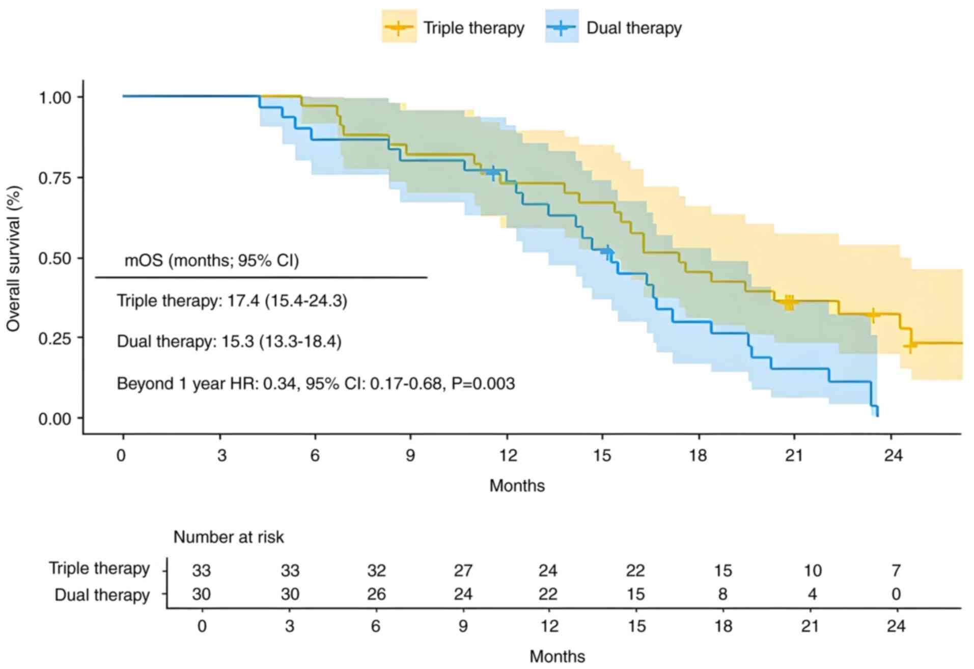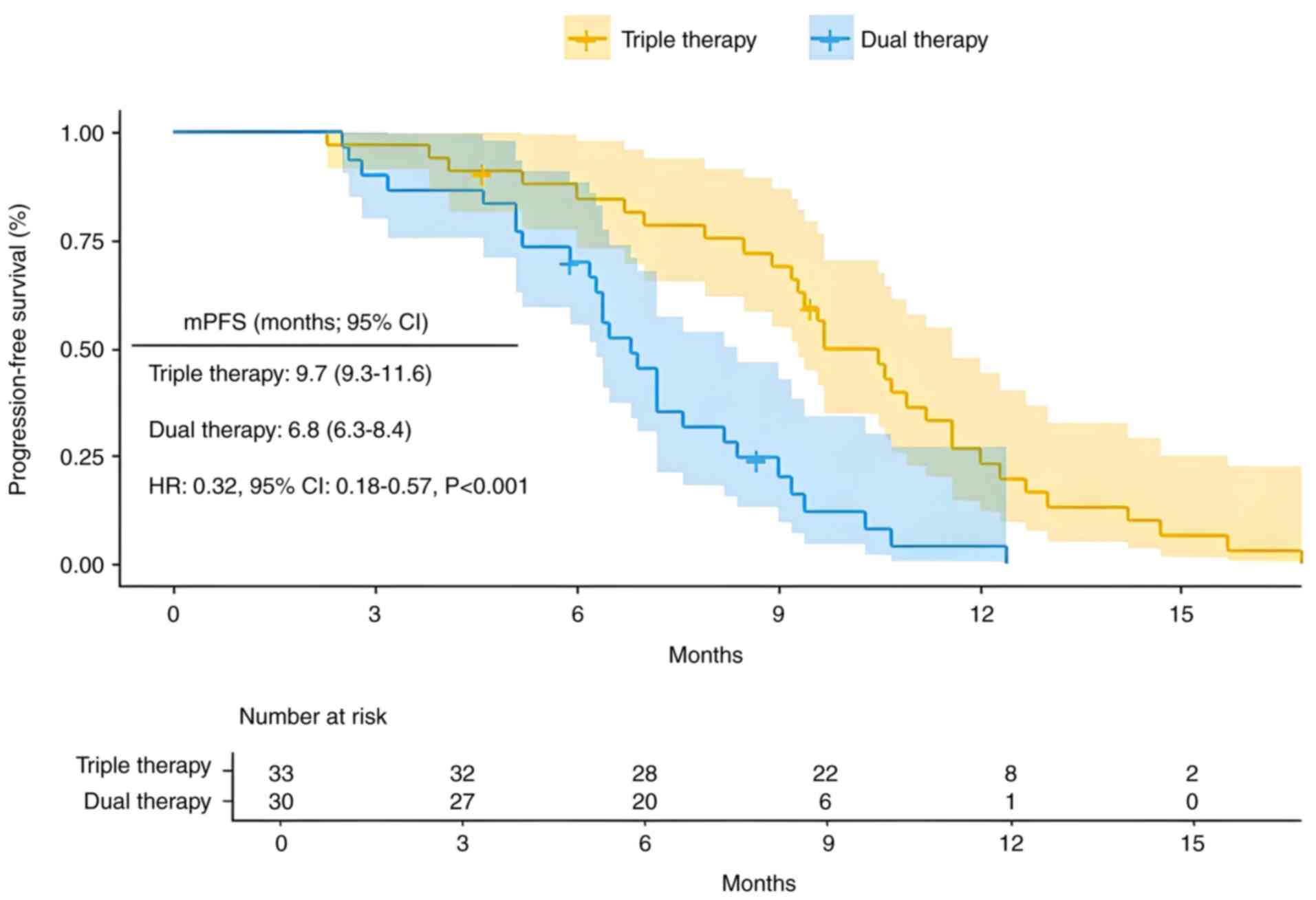 A total of 63 patients who met the criteria were included in the present retrospective cohort study. The last follow-up date was June 2024, and the median follow-up time was 26.6 months. The baseline characteristics of the enrolled patients are summarized in Table I. Among the 63 patients, 33 were male and 30 were female, with a median age of 56 years (Q1, 46.5; Q3, 64.0). The majority of the patients were infected with HBV, and 43 HBsAg-positive patients accounted for 68.3% of the total population. The proportions of Child-Pugh A and B were 69.8 and 30.2%, respectively. Most patients were diagnosed at an advanced stage, with 45 patients (71.4%) classified as BCLC C stage, thereby losing the opportunity for surgical resection. Additionally, a notable number of patients exhibited PVTT. Among patients with PVTT, 38 were classified as type Vp3-4, accounting for 60.3%. Of these, 21 received triple therapy, while 17 received dual therapy. There were 20 patients with extrahepatic metastasis, accounting for 31.7%. Among them, 12 patients received dual therapy and 8 received triple therapy.