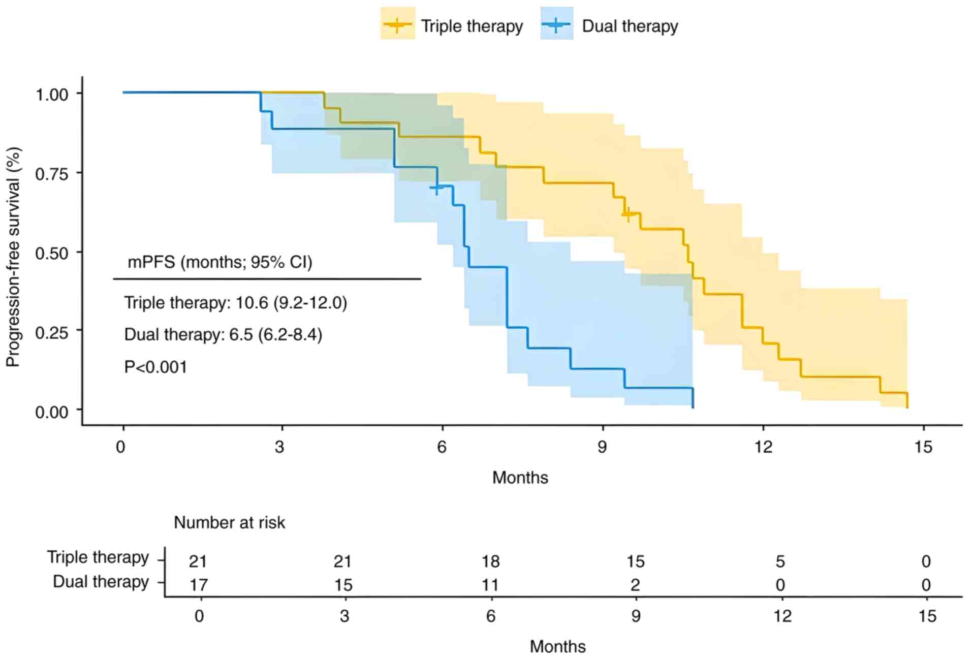 Regarding safety, in the triple therapy group, the incidence of any grade AEs, listed from highest to lowest, was as follows: Abdominal pain (21 patients, 63.6%), increased aminotransferase (19 patients, 57.6%), nausea and vomiting (15 patients, 45.5%), fatigue (14 patients, 42.4%), hypertension (14 patients, 42.4%), hyperbilirubinemia (13 patients, 39.4%), leukopenia (12 patients, 36.4%), thrombocytopenia (12 patients, 36.4%) and pruritus (11 patients, 33.3%). In the dual therapy group, the incidence of any grade AEs was as follows: Fatigue (10 patients, 33.3%), hypertension (9 patients, 30.0%), pruritus (8 patients, 26.7%), increased aminotransferase (7 patients, 23.3%), proteinuria (6 patients, 20.0%) and leukopenia (5 patients, 16.7%). The incidence of any grade AEs was higher in the triple therapy group compared with the dual therapy group, specifically for abdominal pain (63.6 vs. 13.3%; P<0.001), increased aminotransferase (57.6 vs. 23.3%; P=0.006), nausea and vomiting (45.5 vs. 13.3%; P=0.006) and hyperbilirubinemia (39.4 vs. 13.3%; P=0.02). All these AEs were graded as mild (grade 1–2) and were well-tolerated by patients, with no significant impact on treatment progression.