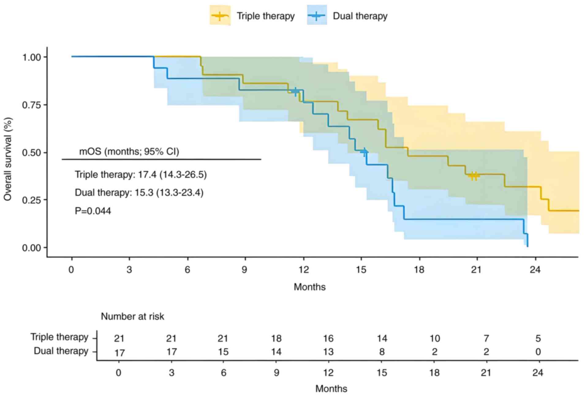 In the present cohort study, a total of 38 high-risk patients with advanced HCC characterized by Vp3-4 vascular invasion were recruited. Among these patients, 21 received triple therapy, while 17 received dual therapy. The triple therapy exhibited significantly improved clinical outcomes compared with the dual therapy, with mPFS of 10.6 months (95% CI, 9.2–12.0) vs. 6.5 months (95% CI, 6.2–8.4) (Fig. 4; P=0.00018). Additionally, mOS was 17.4 months (95% CI, 14.3–26.5) for triple therapy vs. 15.3 months (95% CI, 13.3–23.4) for dual therapy (Fig. 5; P=0.044).