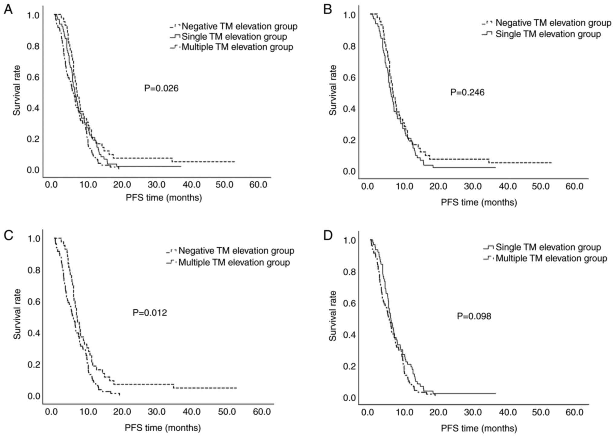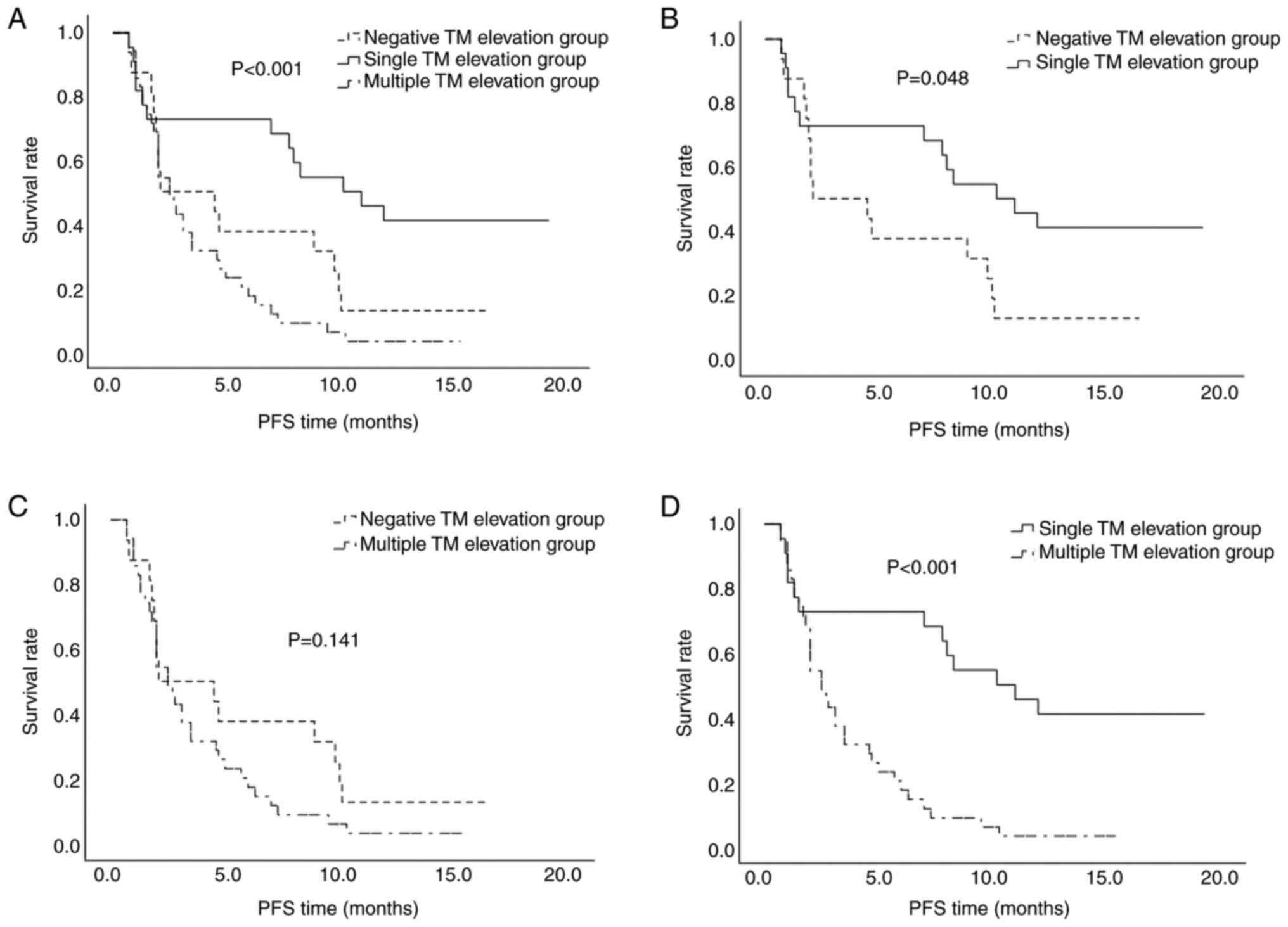 When the sum of the diameters of the metastatic lesions was ≥6 cm, a significant intergroup difference was observed in the DCR, with the highest value (66.7%) in the single TM elevation group (P=0.046). The median PFS time for the negative, single TM elevation and multiple TM elevation groups was 1.9, 8.0 and 2.5 months, respectively (P=0.015, Table IV; P=0.037, Fig. 3), indicating superior disease control in the single TM elevation group. When the diameter of the metastatic lesions was <6 cm, the median PFS time for the negative, single TM elevation and multiple TM elevation groups was 4.7, 12.2 and 3.1 months, respectively (P=0.004, Table IV; P=0.002, Fig. 3), indicating that when the tumor diameter was <6 cm, the PFS time was longer.