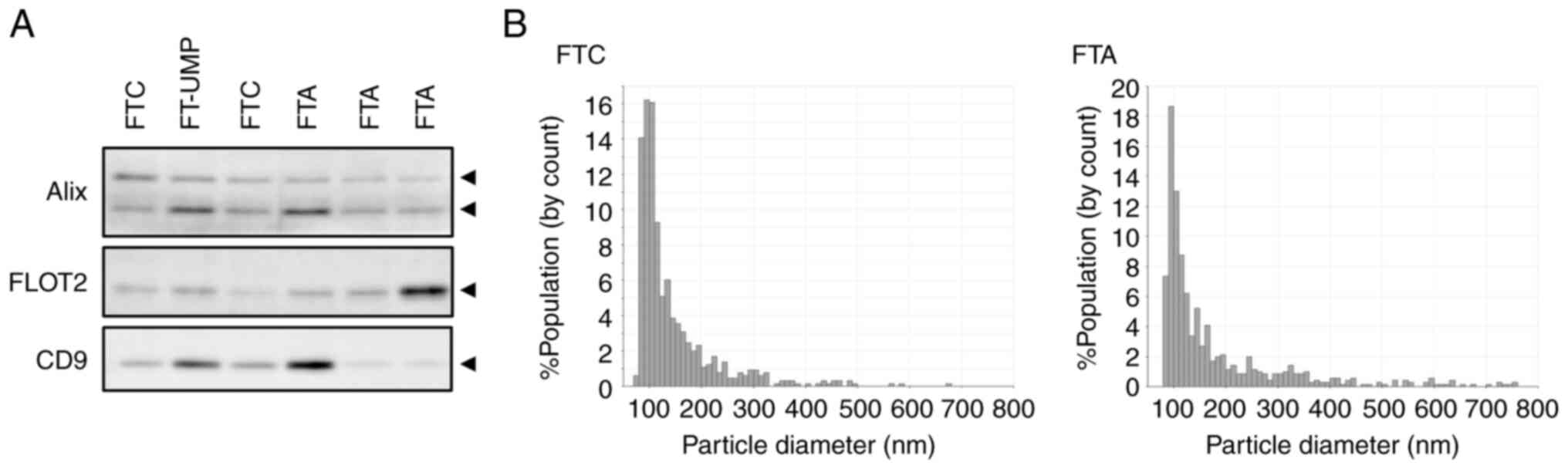 Recent efforts to differentiate FTC from FTA have primarily focused on identifying molecular markers using formalin-fixed, paraffin-embedded tissues. Regarding gene markers, genetic mutation analysis revealed FLT3, TP53, and RET were candidate markers for detecting malignancies in follicular lesions (20). Moreover, another study using a gene expression microarray and qRT-PCR identified CPQ, PLVAP, TFF3, and ACVRL1 as potential biomarkers (21). Regarding protein markers, CD56, HBME-1, Galectin-3, and CK19 were reported to be useful for differentiating FTC from FTA based on an immunohistochemical approach (22). Moreover, proteomic analysis demonstrated that ferroptosis pathways were altered in malignant follicular carcinoma (23). Regarding DNA methylation markers, Zhang et al (24) identified 70 DNA methylation haplotype block markers, many of which were located in promoter regions (24). Furthermore, combining the detection of thyrotropin receptor mRNA in circulating tumor cells with fine-needle aspiration biopsy results has been reported to improve diagnostic accuracy (25). Additionally, Zabegina et al (26) demonstrated that miRNAs of the let-7 family were upregulated in plasma EVs from FTC patients (26).