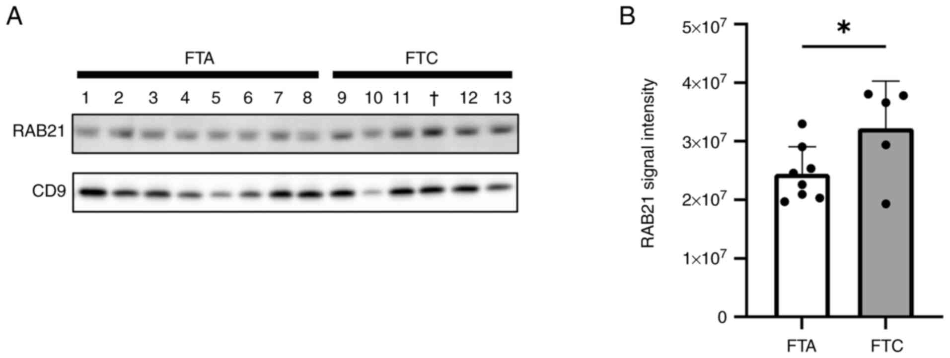 RAB21, a member of the Rab family of small GTPases, has been reported to modulate cell adhesion and migration processes (15). Therefore, we focused on RAB21, and attempted to validate its upregulation in FTC serum EVs using western blot analysis, as well as in FTC tissues through in silico analyses. First, we examined the RAB21 levels in serum EVs by western blot analysis using CD9 as an EV marker and confirmed that RAB21 was more abundant in the serum EVs of FTC patients than in those of FTA patients (Figs. 3 and S1B). Second, we determined whether RAB21 was actually present in EVs, rather than being a contaminant from the blood, because proteins that are abundant in the blood inevitably contaminate EVs purified from serum. We analyzed the levels of RAB21 in blood using the Protein Atlas database (https://www.proteinatlas.org/humanproteome/blood/proteins+detected+in+ms). Compared with the other upregulated proteins, the RAB21 level was remarkably low (Fig. S2), so we considered that RAB21 was derived from EVs and was not a contaminant from the blood, and that FTC tissues might contain abundant RAB21. Third, we estimated RAB21 mRNA expression in FTC and FTA tissues using the GSE15045 dataset from the GEO public database. This suggests that RAB21 mRNA was significantly upregulated in FTC compared with the level in FTA (Fig. S3). These findings indicate that RAB21 is upregulated in FTC tissues and that its levels are increased in serum EVs from FTC patients.