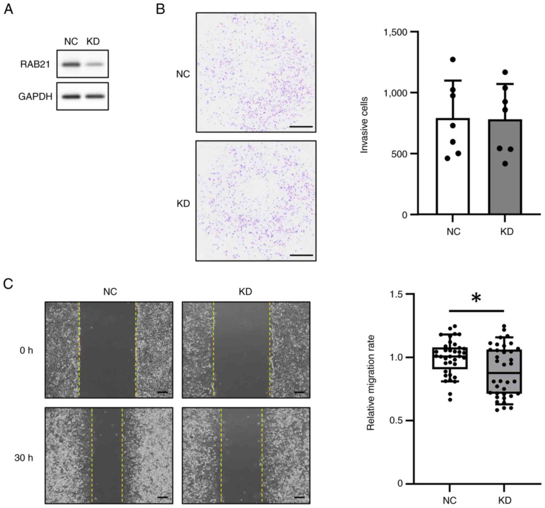 Because RAB21 gene expression was increased in the tissues of FTC patients, we considered that RAB21 might be involved in the malignant phenotype of tumors. Therefore, we examined whether the knockdown (KD) of RAB21 expression in FTC-133 cells, a follicular thyroid carcinoma cell line, might affect malignant phenotypes such as invasion and migration. RAB21-KD in FTC-133 cells was performed using DsiRNA and Lipofectamine RNAiMAX, and confirmed by western blot analysis (Figs. 4A and S1C). Cell invasion was performed using a Matrigel invasion chamber for 24 h. The results showed that the invasion of RAB21-KD cells did not differ from that of the negative control (NC) (Fig. 4B). However, the cell migration rate calculated from the change in wound area during 30 h was significantly decreased in RAB21-KD cells (Fig. 4C). Taken together, these findings suggest that RAB21-KD did not affect cell invasion but reduced the migration of FTC-133 cells under these experimental conditions.