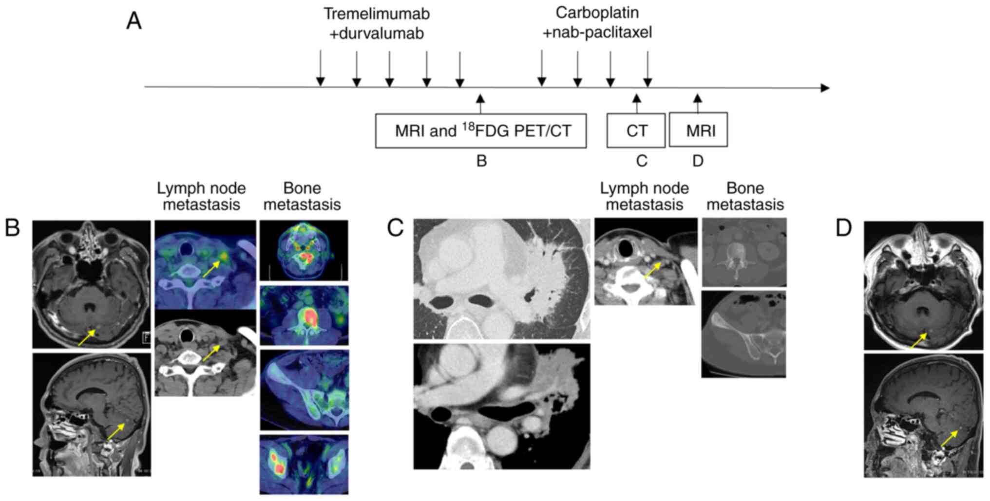 The phase III POSEIDON trial evaluated first-line treatment for advanced NSCLC by comparing a regimen of durvalumab, tremelimumab, and chemotherapy with chemotherapy alone. This combination significantly improved the progression-free survival and OS of patients (6). Furthermore, addition of durvalumab to chemotherapy significantly increased progression-free survival. However, as the patients had not previously received durvalumab, the effectiveness of the regimen for recurrence during post-CCRT durvalumab therapy remains unverified. In contrast, the CheckMate 9LA trial evaluated a dual-checkpoint strategy using nivolumab and ipilimumab with only 2 chemotherapy cycles while continuing CTLA-4 blockade in the maintenance phase (17). Both trials supported the combination of anti-CTLA-4 and anti-PD-L1 antibodies with chemotherapy for treatment-naive NSCLC. Our patient, who was diagnosed with lung adenocarcinoma without actionable driver mutations (EGFR or ALK) and with negative PD-L1 expression at initial diagnosis, shares key pathological features with the populations enrolled in both trials. The POSEIDON trial reported approximately 70% of enrolled patients with nonsquamous histology and 38% with PD-L1 expression <1%, while the CheckMate 9LA trial included patients with both squamous and nonsquamous histologies and a broad range of PD-L1 expression levels. Thus, from a pathological standpoint, our case is consistent with these study populations.