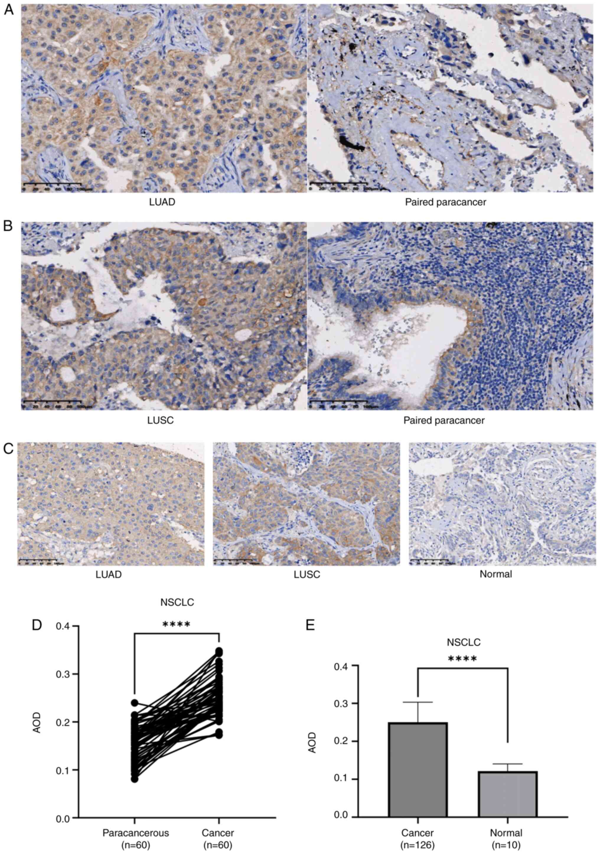 According to GLOBOCAN statistics, lung cancer is the most frequently diagnosed cancer globally and a major contributor to cancer-related deaths worldwide, accounting for ~12.4% of all new cancer cases and 18.7% of all cancer deaths in 2022 (1). Non-small cell lung cancer (NSCLC), primarily consisting of lung adenocarcinoma (LUAD) and lung squamous cell carcinoma (LUSC), is the predominant form of lung cancer (2). In previous years, substantial strides have been made in the treatment of lung cancer, including advancements in screening, diagnosis and minimally invasive treatments. Additionally, progress in radiotherapy, including stereotactic ablative radiotherapy, has become an effective approach for treating lung cancer (3–5). Meanwhile, the emergence of new targeted therapies and immunotherapies has markedly improved the survival rate of patients with NSCLC (6,7). Patients with NSCLC who are eligible for targeted therapy and immunotherapy now have a longer survival time, with a 5-year survival rate ranging from 15.0 to 62.5%, depending on the biomarkers (8). This underscores the importance of identifying new molecular markers and therapeutic targets for NSCLC.