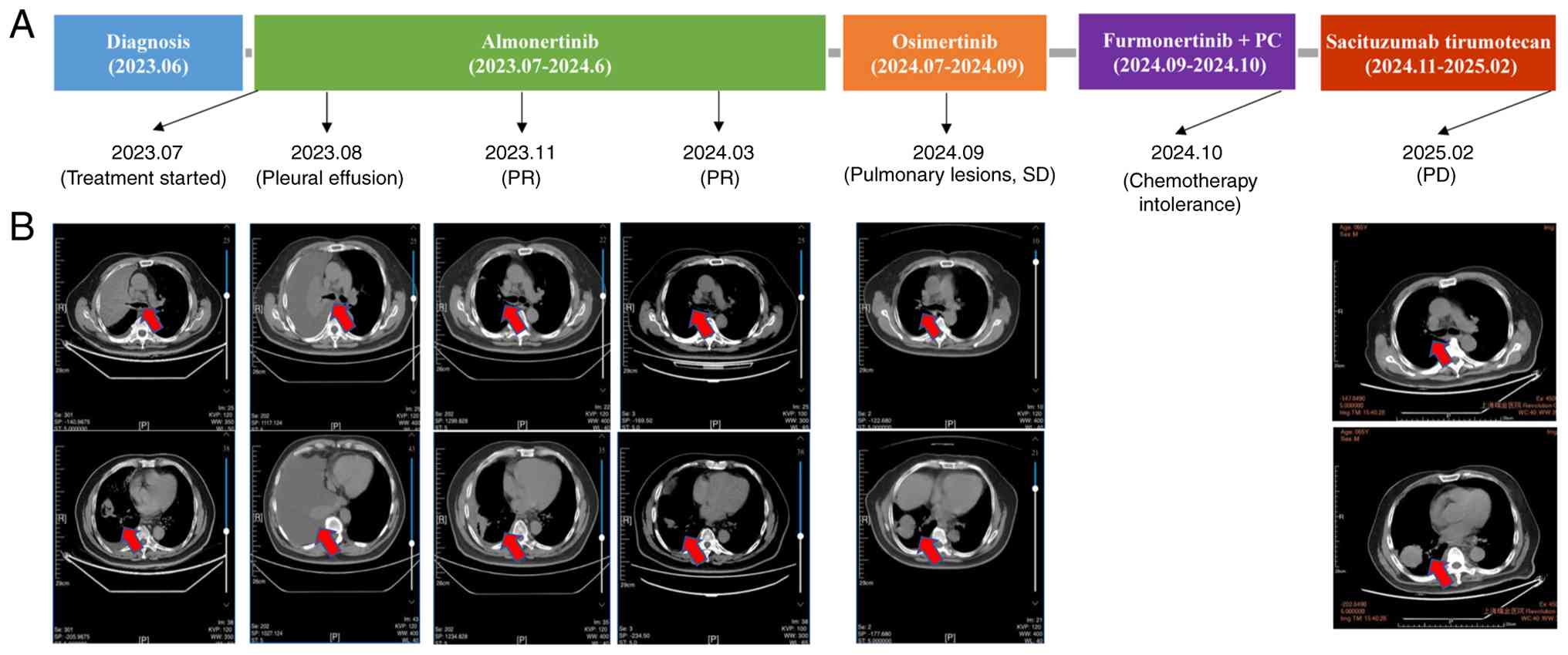 By September 2024, imaging revealed stable pulmonary lesions (Fig. 2B) but progression in bone lesions (pelvis, spine and femur) (Fig. S1A). Therefore, in September 2024, the treatment regimen was modified to furmonertinib (80 mg, administered orally once daily) combined with pemetrexed (800 mg) and carboplatin (450 mg), both administered intravenously every 3 weeks (PC regimen), the standard of care following EGFR-TKI resistance (13). ctDNA declined from 380.7 to 120.2 hGE/ml; however, the patient discontinued chemotherapy after 1 month due to intolerance. Following a third MDT consultation, due to the chemotherapy intolerance of the patient, disease progression, and the strong preference of the patient and their family to avoid further cytotoxic therapy, treatment with the TROP2-targeted ADC sacituzumab tirumotecan (300 mg, administered intravenously every 2 weeks) was initiated in November 2024. Although the drug was not yet approved at the time of administration, it subsequently received approval on March 10, 2025, by the National Medical Products Administration for adults with locally advanced or metastatic EGFR-mutated NSCLC who had progressed after EGFR-TKI and platinum-based chemotherapy (24), which further supports its use as an individualized option in the present case. Subsequently, in December 2024, ctDNA decreased to 33.6 hGE/ml, indicating an early molecular response.
