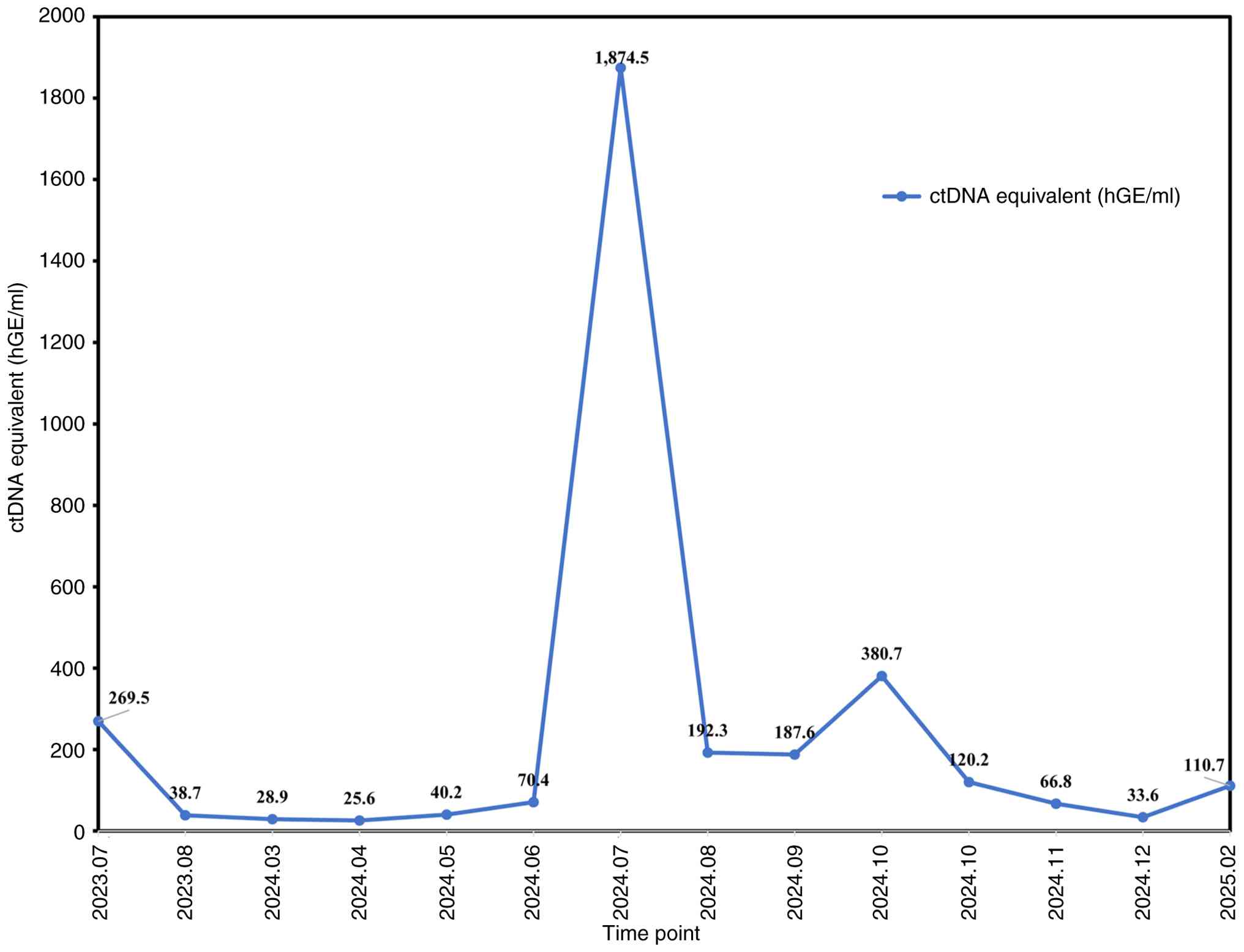 In June 2024, ctDNA increased markedly to 70.4 hGE/ml (Fig. 3), with the EGFR C797S allele fraction increasing to 0.30% (Table I), suggesting molecular progression despite stable imaging. The patient achieved a PFS of 11 months on almonertinib (Fig. 2A). Subsequently, therapy was switched to osimertinib (80 mg, administered orally once daily) as an individualized bridging strategy, despite lateral third-generation TKI switching not being the standard guideline practice (12,13). In addition, in August 2024, ctDNA decreased from 1,874.5 hGE/ml to 192.3 hGE/ml (Fig. 3), but levels did not continue to decline.