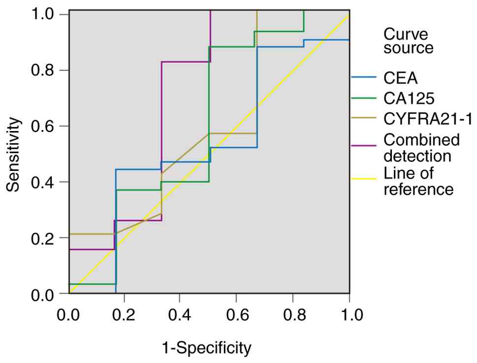 Table III.Evaluation of the efficacy of CEA, CA125, CYFRA21-1 levels and combined detection for the short-term treatment of non-small cell lung cancer with tislelizumab combined with gemcitabine-cisplatin chemotherapy. |