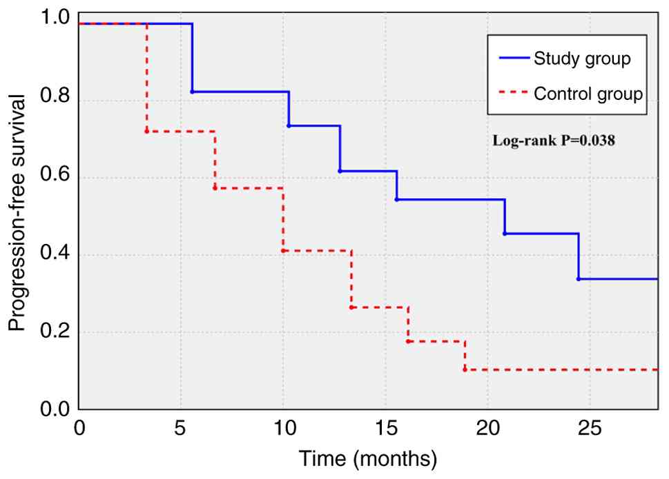 The incidence of AEs in the study group was numerically lower compared with that in the control group, although no statistically significant differences were observed (P>0.05 for all comparisons) (Table V). Grade I anemia occurred in 4 patients in the control group vs. 2 patients in the study group (χ2=0.714; P=0.398), whereas Grade II anemia was reported in 2 vs. 1 cases (χ2=0.322; P=0.570). Neutropenia rates were similarly comparable: Grade I (3 vs. 2; χ2=0.212; P=0.645) and Grade II (2 vs. 1; χ2=0.345; P=0.557). Elevated alkaline phosphatase levels also indicated no significant intergroup differences, with similar numbers of Grade I (3 vs. 2) and Grade II (2 vs. 1) events. Cutaneous reactions such as Grade I maculopapular rash (1 vs. 0; χ2=1.011; P=0.315) and gastrointestinal toxicities, including Grade I nausea (12 vs. 8; χ2=1.029; P=0.310), Grade II nausea (8 vs. 11; χ2=0.600; P=0.439) and Grade I vomiting (9 vs. 5; χ2=1.353; P=0.245), were marginally reduced in the study group but did not reach statistical significance.