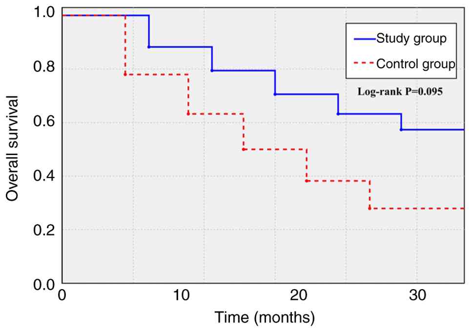 The median follow-up duration for the entire cohort was 23.5 months (range, 5.0–52.0 months). Long-term follow-up data revealed notable survival outcomes in the study group compared with those in the control group. As shown in the Kaplan-Meier analysis for PFS (Fig. 2), the median PFS (the time at which 50% of patients were progression-free) was significantly longer in the study group (20.8 months; 95% CI, 13.6–25.4) compared with in the control group (10.0 months; 95% CI, 7.1–12.9) (HR, 0.66; 95% CI, 0.43–0.98; log-rank P=0.038). Regarding OS (Fig. 3), the study group demonstrated a trend towards improvement, with a median OS (the time at which 50% of patients remained alive) that was not reached (95% CI, 19.8-not reached) compared with 16.0 months (95% CI, 13.5–18.5) in the control group (HR, 0.71; 95% CI, 0.47–1.07; log-rank P=0.095).