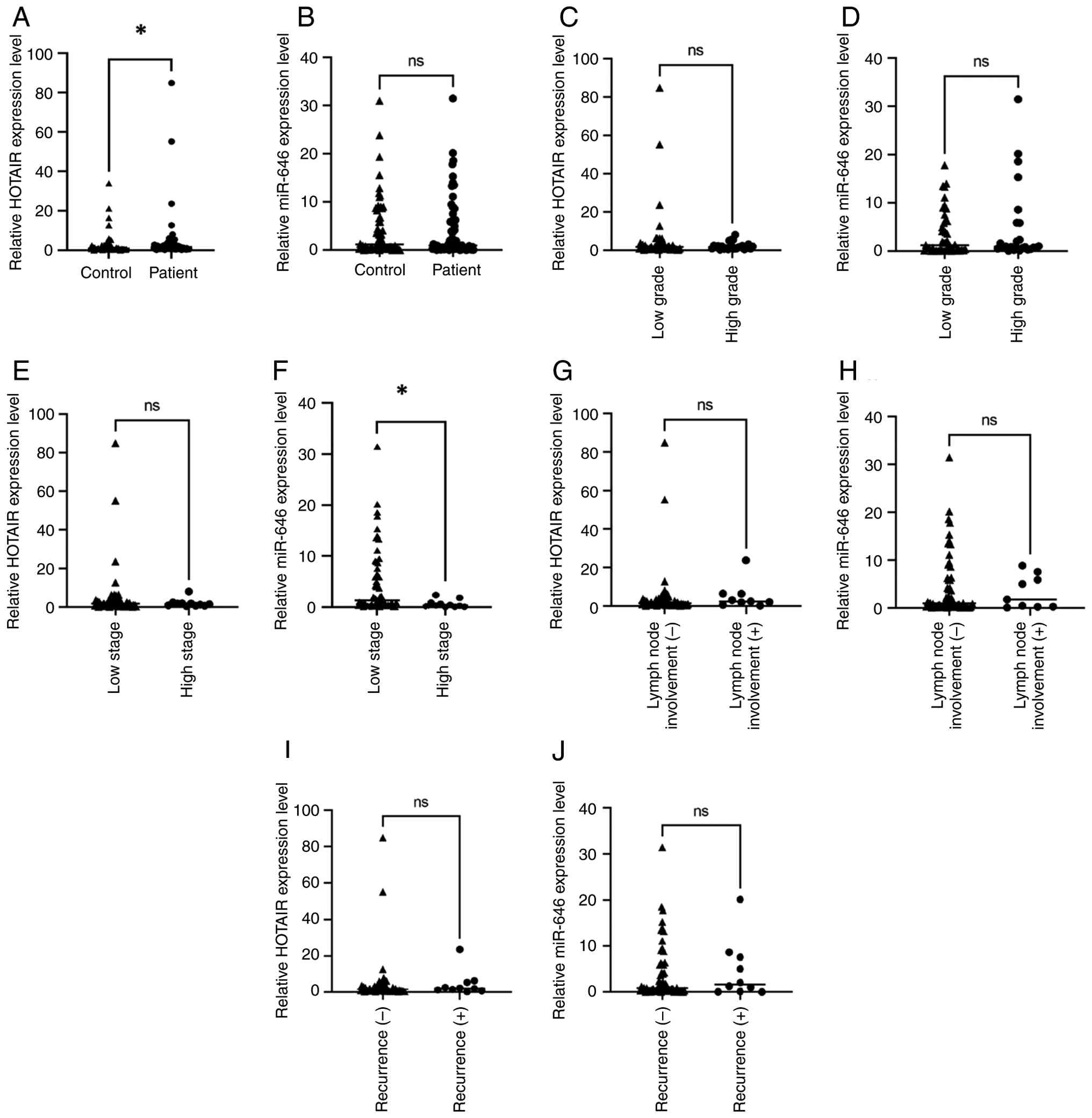 The study population consisted of women aged ≥18 years with histologically confirmed EC, diagnosed by endometrial biopsy and managed surgically. All participants provided written informed consent prior to inclusion. Patients with biopsy-proven EC of any histopathological subtype who underwent hysterectomy with surgical staging and subsequent histopathological evaluation of the surgical specimens were included. The control group included women who attended the general gynaecology outpatient clinic for non-malignant gynaecological conditions and who had no history of malignancy. Patients were excluded if they declined to provide informed consent, were medically inoperable, refused surgical treatment, had a final pathology not confirming EC, had synchronous or other primary malignancies, had recurrent disease, or had received prior oncologic treatments such as chemotherapy, radiotherapy or immunotherapy. The present study examined the association between HOTAIR and miR-646 gene expression levels and the development of EC. Additionally, the association between prognostic factors of EC, such as grade and clinical T stage, and the expression of HOTAIR and miR-646 was investigated. In total, 71 patients that were admitted to the Department of Obstetrics, Gynaecology-Oncology Division, Istanbul Medical Faculty, Istanbul University (Istanbul, Turkey) and diagnosed with EC based on biopsy results, were included in the present study. Additionally, 62 healthy women who sought services at the Department of Obstetrics and Gynaecology, Istanbul Medical Faculty, Istanbul University, for routine gynaecological examination or benign conditions were included in the control group. Patients and healthy control individuals were enrolled in the present study between August 2021 and March 2023. The study protocol was reviewed and approved by the Institutional Review Board and Ethics Committee of Istanbul University (Istanbul, Turkey; approval no. 272576; approval date, 01.07.2021). Sample collection and experimental analyses were completed by June 2023. Blood samples were collected after both the patients and control individuals were informed verbally and in writing.