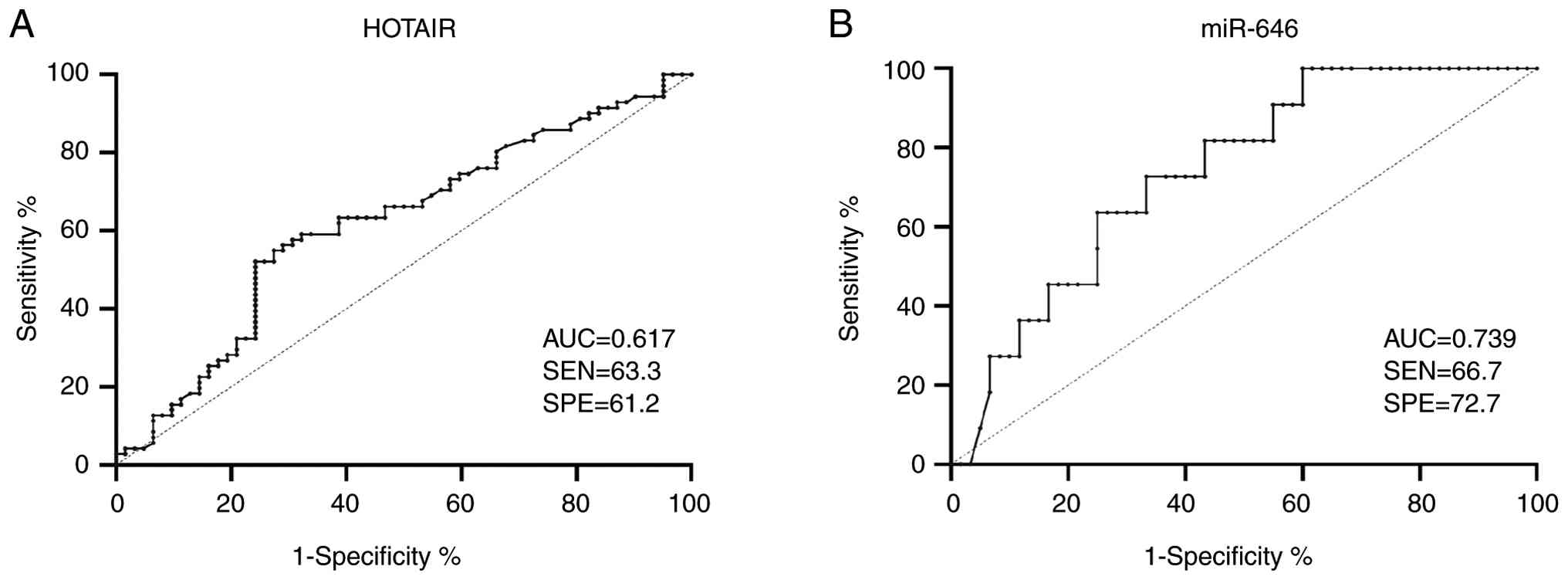 The associations between serum levels of HOTAIR and miR-646 with CA-125 were further investigated; however, no significant associations were revealed. ROC curve analysis of HOTAIR revealed an area under the curve of 0.617, with an optimal threshold value of 1.08, sensitivity of 63.3% and specificity of 61.2%. This suggested a modest diagnostic accuracy. Although these values indicated a modest diagnostic accuracy, they fall below the commonly accepted criteria for clinical applicability (AUC >0.80; sensitivity and specificity >80%) (71), which suggested that serum HOTAIR alone was insufficient for diagnostic use; however, it may serve as a potential adjunct biomarker. Future research focusing on exosomal HOTAIR expression levels may enhance diagnostic performance.