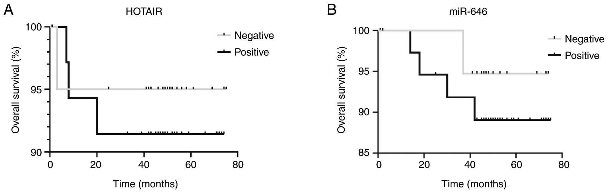 No statistically significant differences in overall survival (in months) were observed between the HOTAIR-positive and -negative groups or between the miR-646-positive and -negative groups (Fig. 3).
