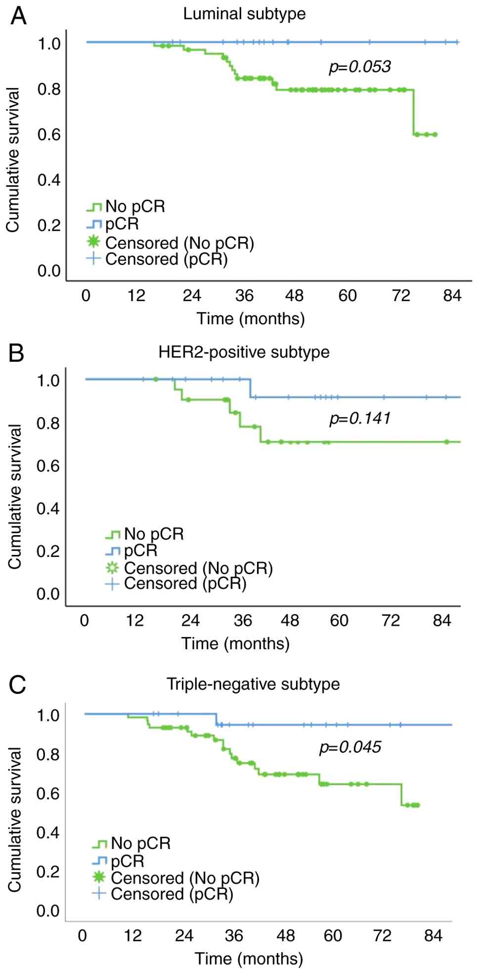 The pCR group had a significantly higher 5-year OS rate than the no pCR group in patients with the TN subtype (64.3 vs. 94.4%;). In patients with the luminal and HER2-positive subtypes, the 5-year OS rate of the pCR group was higher than that of the no pCR group, but the difference was not significant (100.0 vs. 78.9% for luminal subtype; and 91.7 vs. 70.9% for HER2-positive subtype, respectively; Fig. 2).