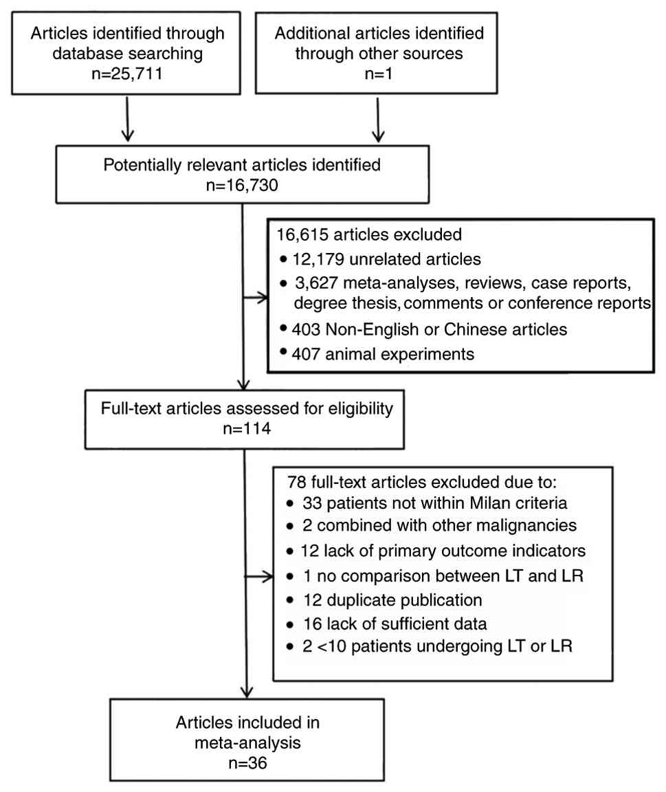 The inclusion criteria were as follows: i) Studies comparing the efficacy and prognosis of LT and LR for HCC; ii) patients with HCC meeting the Milan criteria, with pathological confirmation; iii) interventions involving LR or LT; iv) studies providing relevant outcome data, including 1-, 3-, 5- and 10-year OS, DFS and RR; and v) full-text articles available in either Chinese or English. The exclusion criteria were as follows: i) Animal studies; ii) meta-analyses, systematic reviews, reviews, case reports, degree thesis, editorials and conference abstracts; iii) studies lacking primary research indicators or duplicated from Surveillance, Epidemiology and End Results Program database data (https://seer.cancer.gov/); iv) studies with <10 cases in either the LT or LR groups; and v) studies where full text could not be accessed.