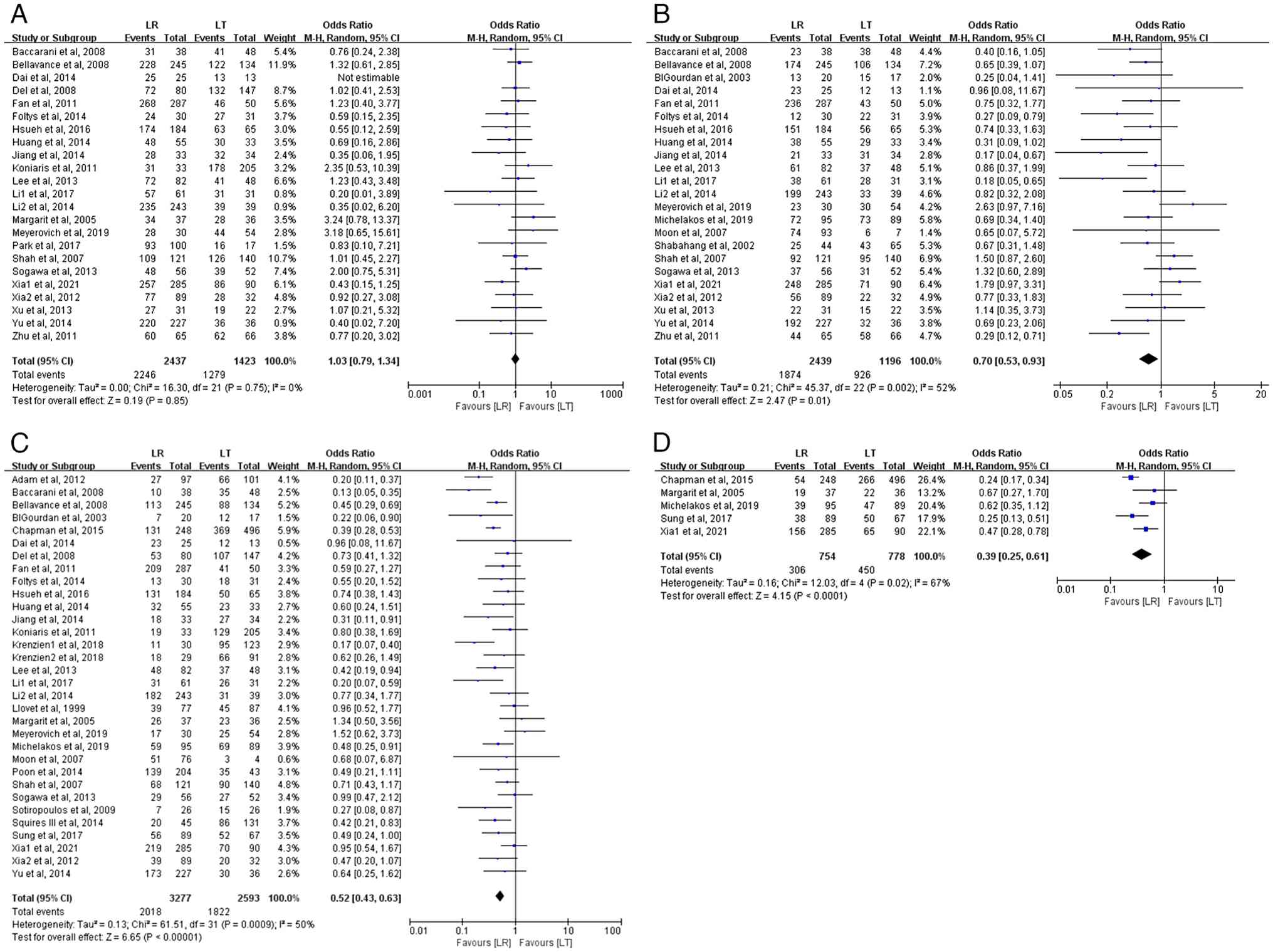 iii) 5-year OS rate. In total, 32 studies assessed the 5-year OS rate, involving 5,870 patients with HCC (3,277 in the LR group and 2,593 in the LT group). The meta-analysis revealed a significant difference in the 5-year OS rate between the two groups, with the LT group having a higher 5-year OS rate (70.3 vs. 61.6%) (OR, 0.52; 95% CI, 0.43–0.63; P<0.00001). There was moderate heterogeneity among the studies (P=0.0009; I2=50%) (Fig. 2C).