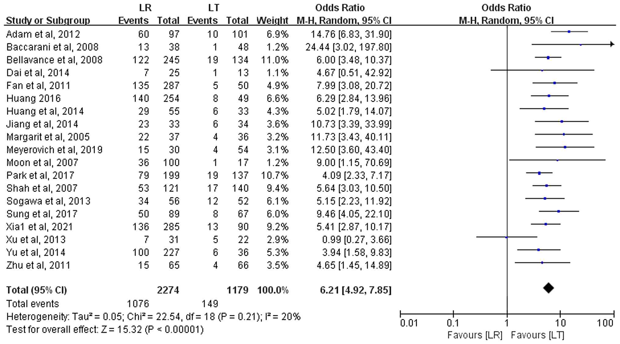 A total of 19 studies with 3,453 patients with HCC (2,274 in the LR group and 1,179 in the LT group) assessed RR. The meta-analysis revealed that the RR after LT was significantly lower compared with that after LR (12.6 vs. 47.3%), with a statistically significant difference (OR, 6.21; 95% CI, 4.92–7.85; P<0.00001). No heterogeneity was observed among the studies (P=0.21; I2=20%) (Fig. 4).