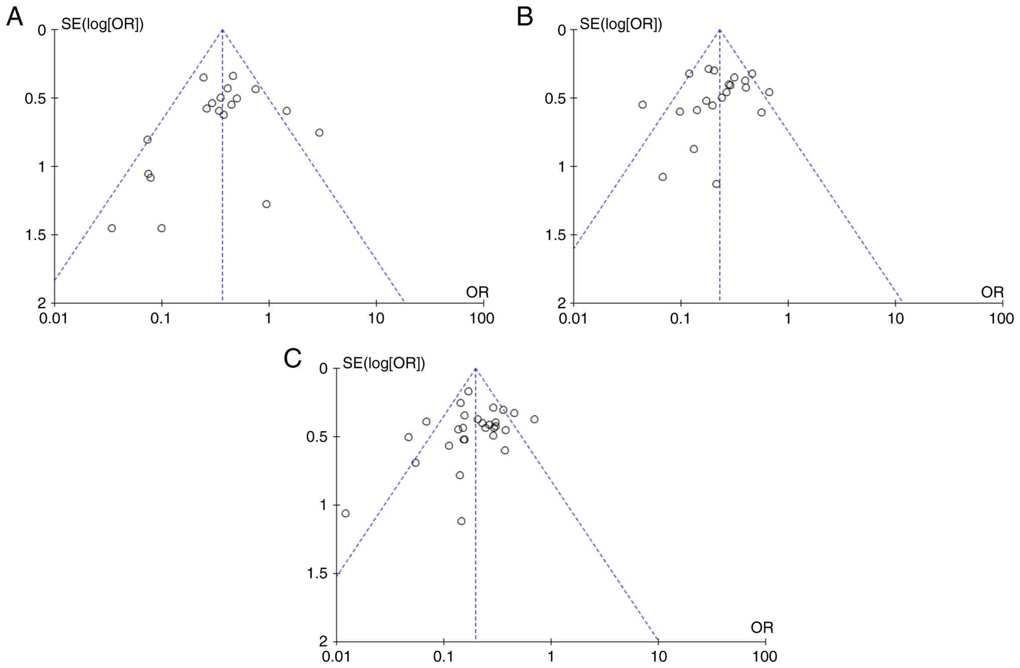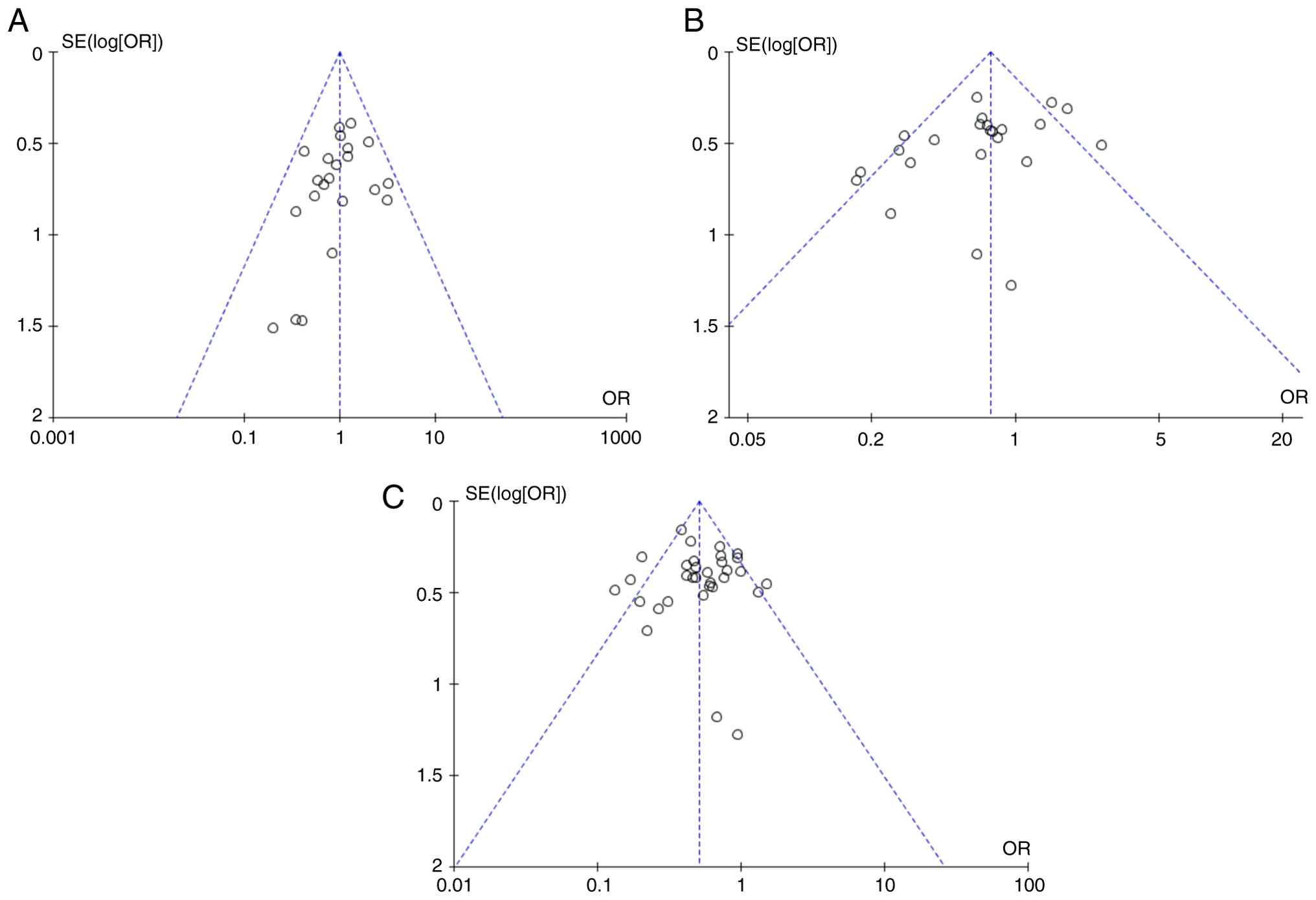 A sensitivity analysis was conducted by sequentially excluding each study with high heterogeneity for outcome indicators. The results revealed that the combined effect of the outcome indicators did not change notably compared with the previous analysis. Publication bias was assessed using funnel plots and all plots displayed varying degrees of asymmetry, indicating potential publication bias (Figs. 5 and 6). These results reflected the limitation of the present analysis due to the lack of published RCT studies.