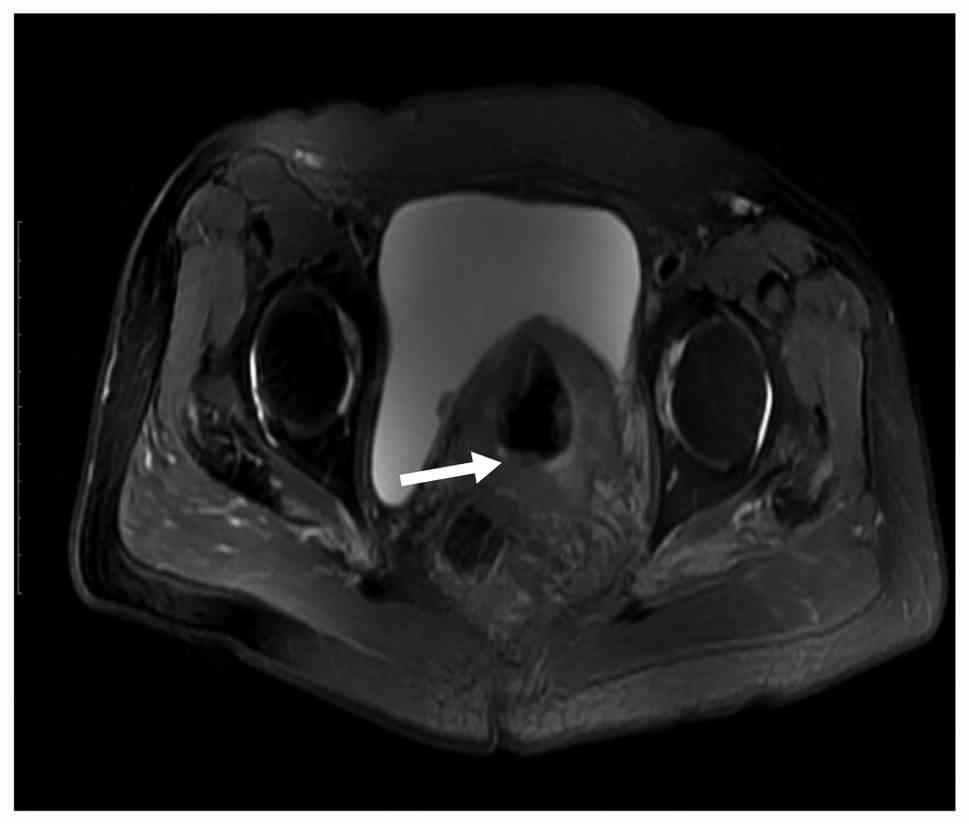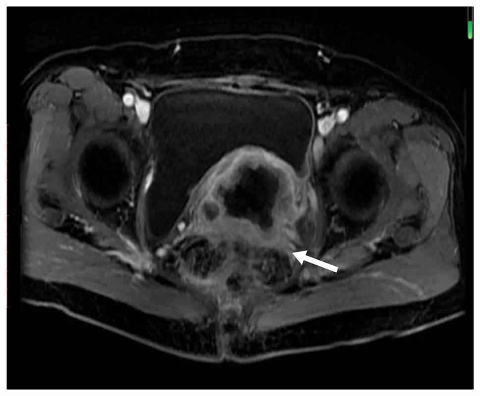Prior to scanning, patients were asked to remove all metallic items, lie in a supine position with legs comfortably extended and maintain a steady breathing pattern. Patients were instructed to hold their breath at the end of exhalation and drink a suitable amount of water to ensure bladder fullness. The pre-examination intravenous injection of gadoterate meglumine contrast agent was administered to all patients. The examinations were conducted using a United Imaging GE Discovery MR750 3.0T MRI scanner (GE Healthcare). During the examination, with hands positioned above their heads, patients underwent sequential scans of pelvic axial T2-weighted imaging (WI), T1WI, diffusion-weighted imaging (DWI) sequences, a sagittal T2WI sequence and a coronal T2WI sequence using a body coil. Scan parameters comprised a slice thickness of 5 mm and an interslice gap of 1 mm. The preoperative staging for cervical cancer was assessed by at least two MRI specialists, each with >3 years of experience, relying on the MRI images of the patients and signs of abnormalities. If opinions were inconsistent, a comprehensive diagnosis was made in consultation with another senior physician.