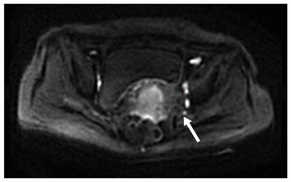 MRI exhibited high sensitivity, specificity and accuracy in diagnosing pelvic LNM, parametrial invasion and vaginal involvement. The sensitivity of MRI in detecting vaginal involvement was higher than that for pelvic LNM and parametrial invasion (P<0.05). The specificity of MRI in diagnosing pelvic LNM showed no difference compared with its specificity in diagnosing parametrial invasion and vaginal involvement (P>0.05). The accuracy of MRI in diagnosing parametrial invasion showed no difference compared with its accuracy in diagnosing pelvic LNM and vaginal involvement (P>0.05; Tables III and IV).