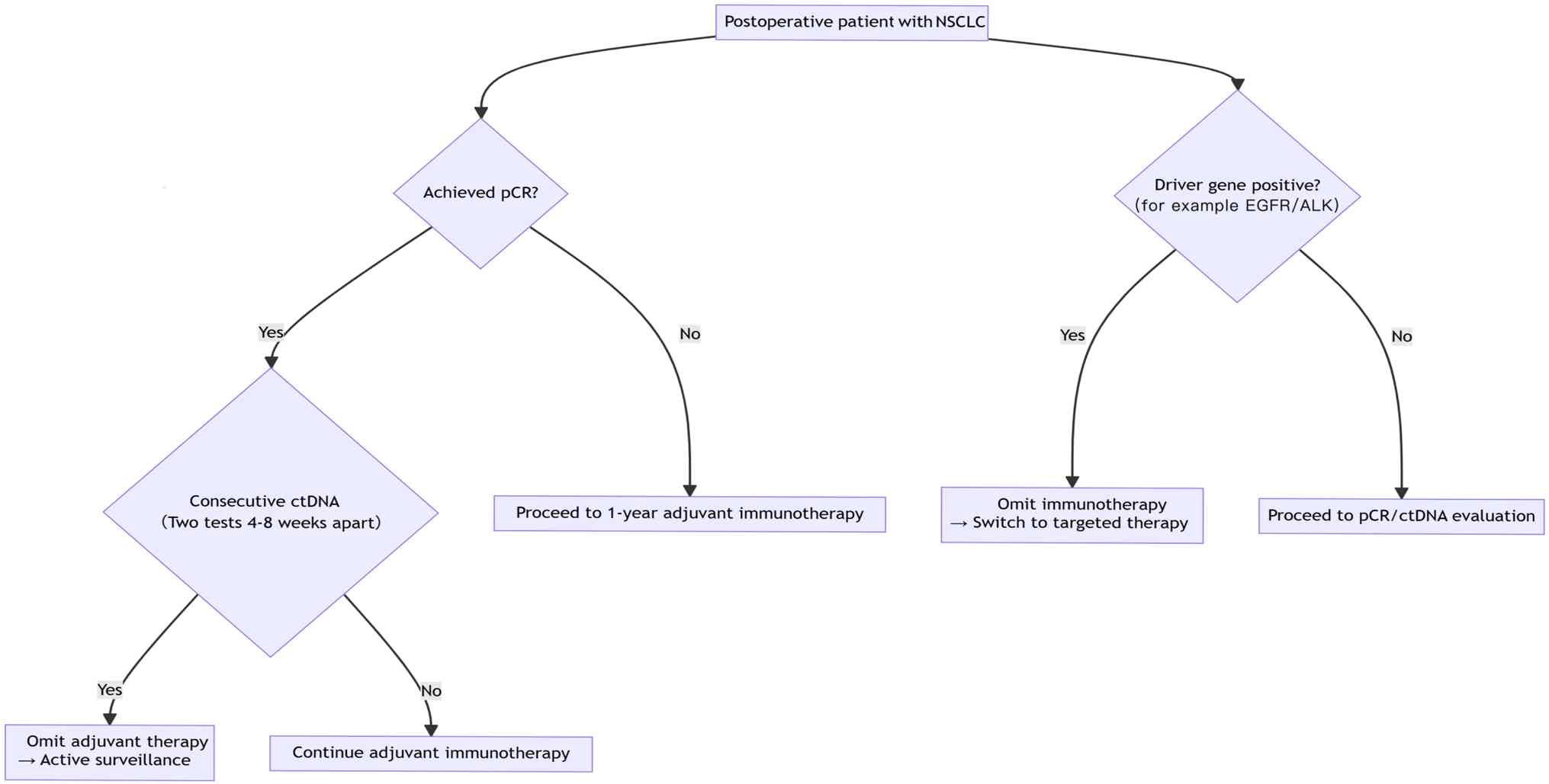 First, ctDNA clearance rates were assessed in patients with advanced unresectable lung cancer after one cycle of neoadjuvant immunotherapy. Those achieving clearance continued with the original treatment regimen, whereas those without clearance either received an additional cycle of neoadjuvant immunotherapy or switched to immunotherapy combined with chemotherapy (95).