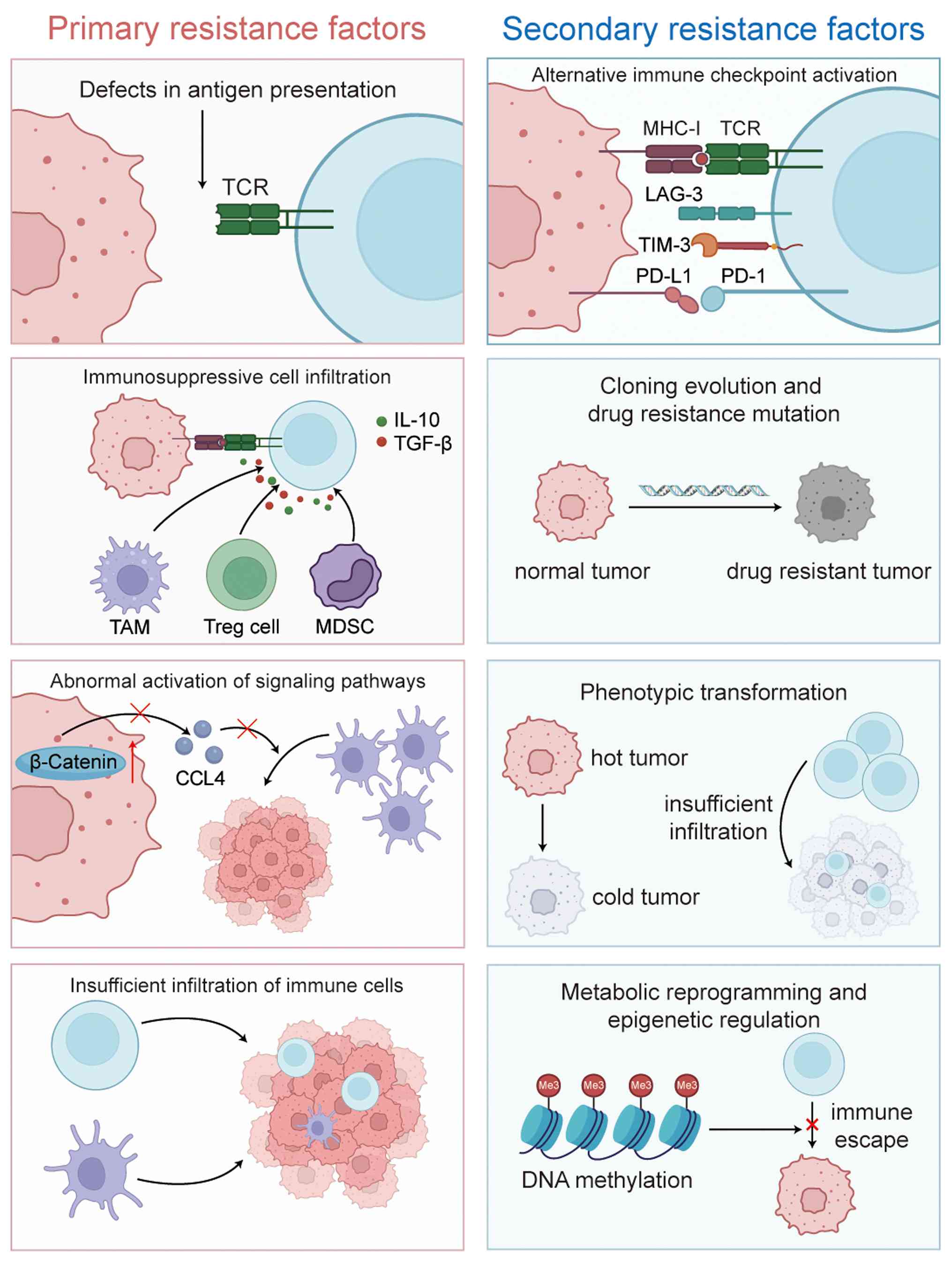 Although perioperative immunotherapy for lung cancer has been reported to be effective and safe in the aforementioned clinical trials, long-term resistance to immunotherapy remains a notable concern, particularly for patients requiring postoperative adjuvant immunotherapy. Generally, the mechanisms of immunotherapy resistance can be categorized into primary and secondary modes of resistance. The core of primary drug resistance lies in the ‘cold’ nature of the TME, characterized by insufficient immune cell infiltration. This is primarily due to disordered tumor vascular structures and defects in the secretion of chemokines such as CXCL9/10, which prevent CD8+ T cells from effectively infiltrating the tumor. Additionally, mutations or epigenetic silencing in genes associated with antigen presentation, such as β-2 microglobulin and transporter associated with antigen processing 1/2, result in the absence of MHC class I molecule expression, thereby creating a ‘blind spot’ for immune recognition and leading to an immunosuppressive state against the tumor cells. Furthermore, this immunosuppressive state is exacerbated by the infiltration of immune-suppressing cells, such as Tregs and MDSCs. These cells create an inhibitory TME by secreting cytokines such as IL-10 and TGF-β and they continue to support tumor cell survival through abnormal activation of the Wnt/β-catenin or PI3K/AKT signaling pathways (107–109). If the tumor evades the initial immune attack, secondary drug resistance will gradually develop. Initially, drug-resistant subclones of the tumor achieve immune escape through mutations in driver genes, such as the EGFR T790M mutation and MET amplification or through epigenetic remodeling that leads to the loss of neoantigens due to DNA hypermethylation. Furthermore, tumor cells enhance glycolysis via the Warburg effect, leading to lactic acid accumulation in the TME, which directly inhibits T-cell function. Additionally, abnormal tryptophan metabolism mediated by IDO1 depletes key amino acids in the local TME, which further disrupts the antitumor immune response. Epigenetic regulation either alters the accessibility of immune-associated genes through chromatin modifications that are mediated via histone deacetylases or dynamically regulates the expression of immune checkpoints such as PD-L1 through non-coding RNA networks, including circular RNA/N6-methyladenosine modifications, thereby forming a multi-dimensional drug resistance barrier. These mechanisms are interlinked, ultimately leading to a decline in the clinical response to immunotherapy (Fig. 3) (110–112).