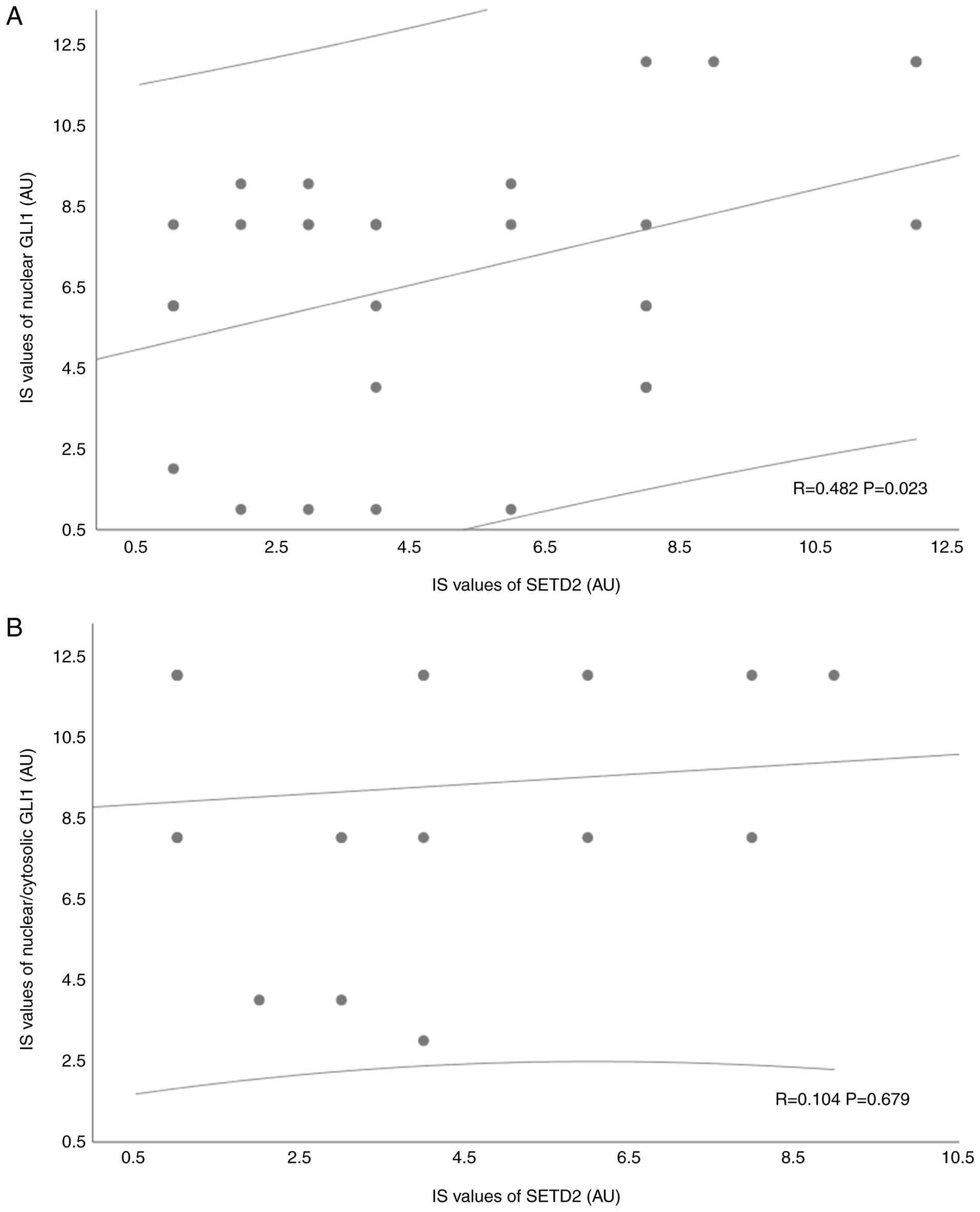 The relationship between SETD2 and GLI1 expression was evaluated based on tumor positivity and IS values. The distribution of samples positive for nSETD2 revealed no statistically significant differences between the nGLI1 (50.0%; 38/76) and ncGLI1 (31.6%; 24/76) groups (Table SVI). However, a positive correlation was detected between nSETD2 and nGLI1 levels based on IS values (R=0.428; Fig. 1A). No significant association was found between nSETD2 and ncGLI1 expression (Fig. 1B).