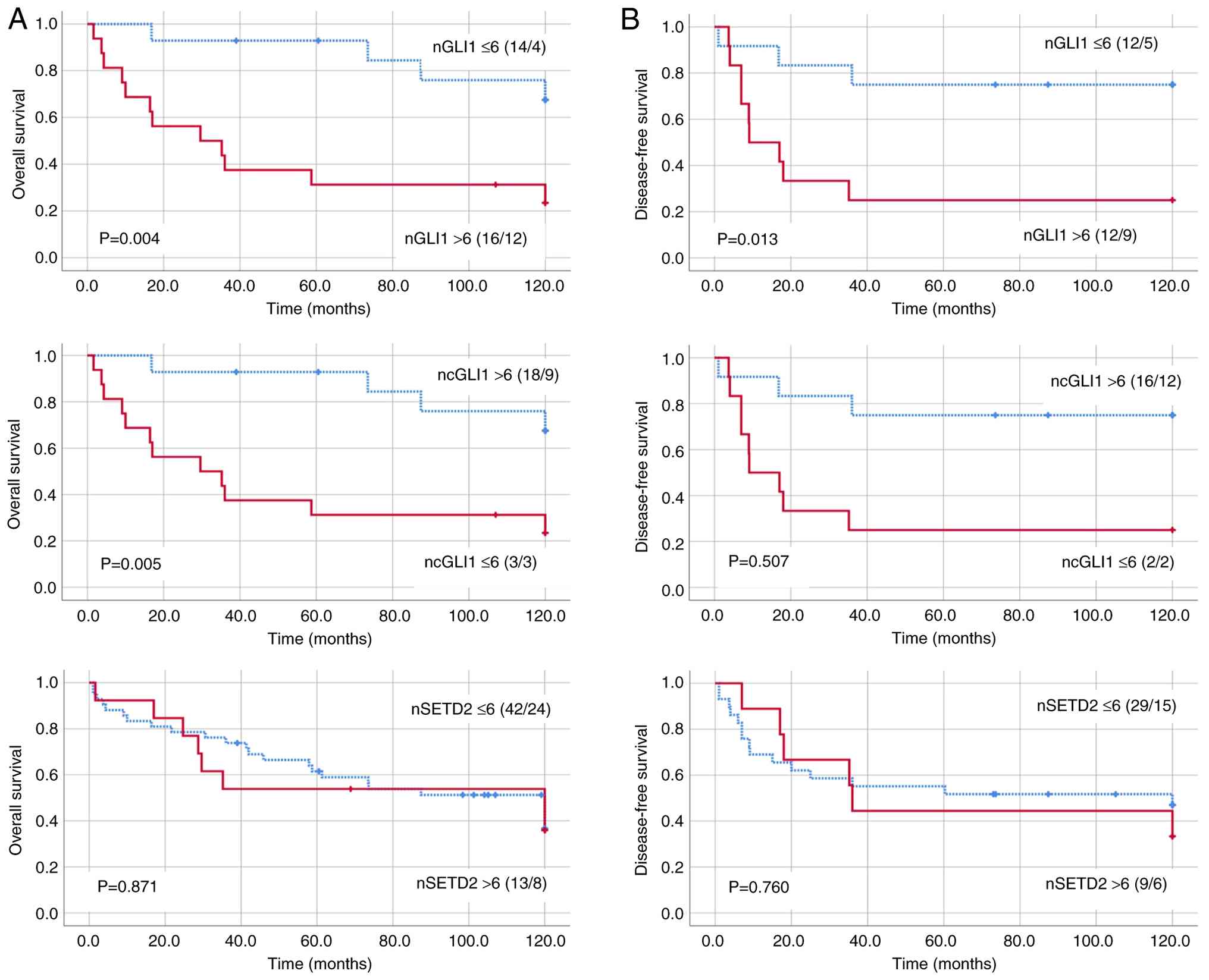 The median follow-up period was 53 months (range, 1–120 months). Patients positive for GLI1 or SETD2 demonstrated no significant differences in OS and DFS rates compared with those negative for these proteins (Fig. S2). The predictive values of SETD2 and GLI1 for OS and DFS were evaluated by categorizing the IS values according to cell positivity >50% in combination with moderate or strong immunoreactivity (IS >6; Figs S3 and S4). Increased GLI1 and SETD2 expression (IS >6) was observed in 65.2% (45/69) and 26.3% (20/76) of cases, respectively. Patients with nGLI1 IS >6 had significantly worse OS and DFS rates compared with those with nGLI1 IS ≤6 (Fig. 2). Conversely, patients with ncGLI1 IS >6 exhibited improved OS compared with those with ncGLI1 IS ≤6. No significant differences were observed in the OS or DFS between the categories for nSETD2.