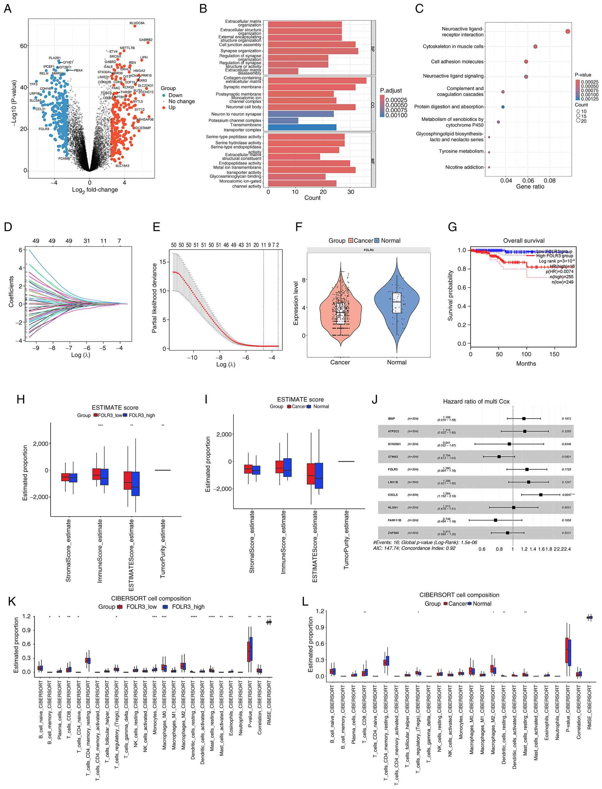 Gene expression data for thyroid cancer were obtained from The Cancer Genome Atlas (TCGA; portal.gdc.cancer.gov/) database and the Gene Expression Omnibus (GEO; ncbi.nlm.nih.gov/geo/) dataset GSE250521 (18). From TCGA, the Thyroid Carcinoma project dataset was downloaded via the Genomic Data Commons Data Portal, which includes RNA-Seq data from tumor and adjacent normal tissue. The combined dataset included clinical information for 572 individuals, comprising of 513 thyroid cancer cases and 59 normal controls. Differential gene expression analysis was performed using the ‘limma’ package in the R software (version 3.64.1; R Development Core Team) (19), with a significance threshold set at adjusted P<0.05 and |log2FC|>2.5. Genes with log2FC >2.5 were considered upregulated, those with log2FC <-2.5 were classified as downregulated and genes with values between −2.5 and 2.5 were regarded as unchanged. Functional enrichment analyses, including Gene Ontology (GO) and Kyoto Encyclopedia of Genes and Genomes (KEGG) pathway analyses were performed using the ‘clusterProfiler’ package (version 4.16.0) in R (20). Univariate Cox regression analysis and multivariate Cox regression analysis were performed using the ‘survival’ (version 3.8–3) and ‘survminer’ packages (version 0.4.9) in R (21). Furthermore, FOLR3 expression in thyroid cancer was evaluated using the GEPIA2.0 (gepia.cancer-pku.cn) and University of Alabama at Birmingham Cancer data analysis Portal (ualcan.path.uab.edu/index.html) databases. For immune/stromal infiltration analysis, Cell-type Identification by Estimating Relative Subsets of RNA Transcripts (CIBERSORT) estimated immune cell proportions via deconvolution, while ESTIMATE calculated immune and stromal scores from signature gene sets (22,23). Together, they provide a comprehensive tumor microenvironment (TME) composition profile.