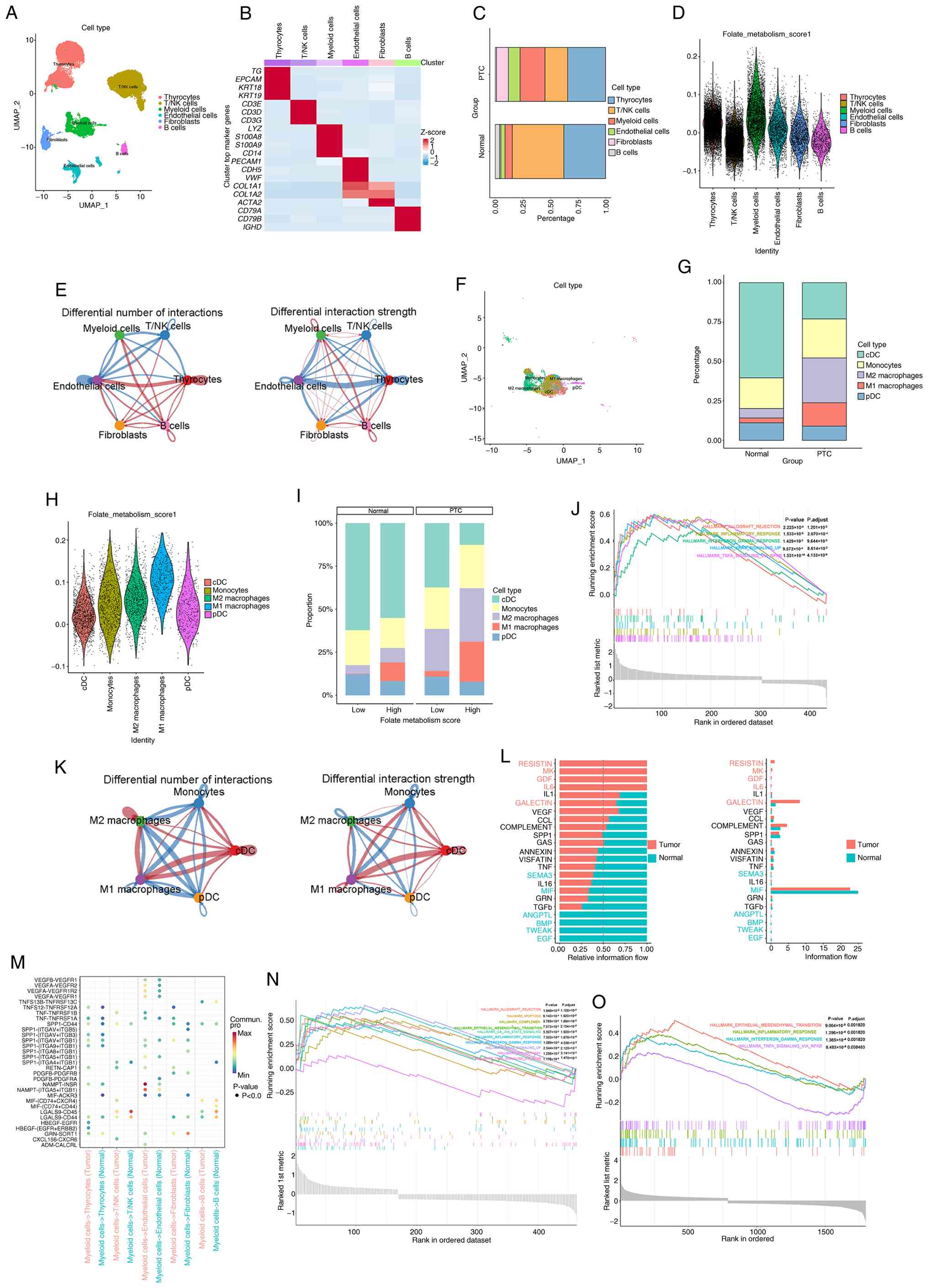 Key findings revealed extensive remodeling of the TME in PTC, beginning with a marked shift in cellular composition: The present study observed a marked decrease in thyrocytes and a concurrent increase in myeloid cells, indicative of enhanced stromal and immune infiltration accompanied by loss of functional thyroid epithelium (Fig. 2C). Further analysis identified elevated folate metabolism activity as a hallmark of PTC, particularly within myeloid cells. Notably, M1 macrophages not only demonstrated the highest folate metabolic score among all subsets but also constituted the majority of cells within the high folate metabolism group (Fig. 2D, H and I). Sub-clustering of myeloid cells confirmed the expansion of M1 macrophages in PTC (Fig. 2F and G) and these cells exhibited pronounced enrichment of immune-inflammatory pathways, including TNF-α, IFN-γ, KRAS and NF-κB signaling, allograft rejection, epithelial-mesenchymal transition and complement activation (Fig. 2J, N and O). Cell communication analysis revealed that M1 macrophages undergo the most notable alterations in both the number and strength of interactions, notably with T/NK cells and engage key ligand-receptor axes such as secreted phosphoprotein 1-CD44, TNF-TNF receptor superfamily, macrophage migration inhibitory factor-(CD74+/CD44/C-X-C motif chemokine receptor 4) and IL6-IL6 receptor, which are key in inflammation, adhesion and immune regulation (Fig. 2E, K and M). In addition, signaling network inference highlighted ‘RESISTIN’, ‘MK’ and ‘GDF’ pathways as key mediators of intercellular crosstalk within the TME (Fig. 2L). Collectively, these results underscore the dual role of M1 macrophages in PTC, mechanistically associating folate metabolism with pro-tumorigenic inflammation and immune modulation and identifying them as pivotal regulators of TME remodeling.