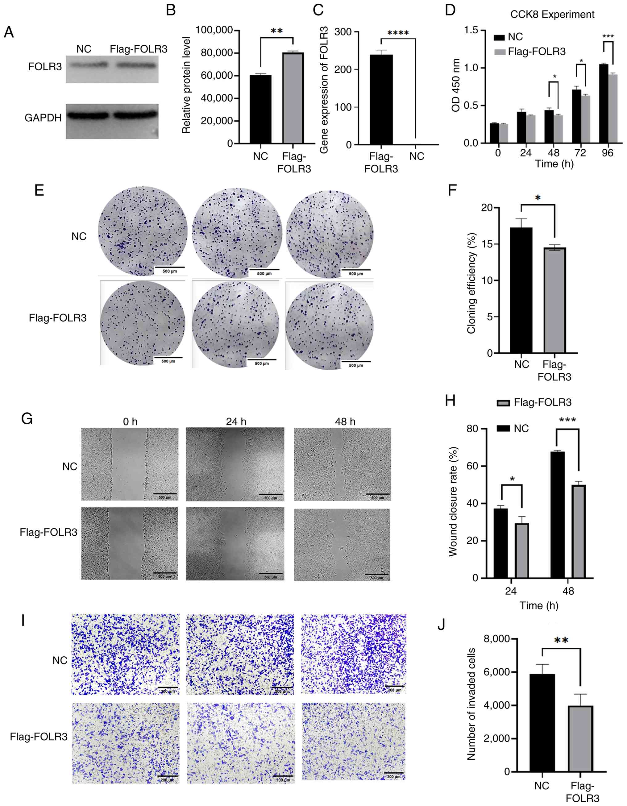 The western blotting analysis (Fig. 4A and B) confirmed successful overexpression of FOLR3 protein in TPC-1 cells of the Flag-FOLR3 group compared with the NC (P<0.01). RT-qPCR results demonstrated a significant upregulation of FOLR3 mRNA expression in the Flag-FOLR3 group (P<0.0001; Fig. 4C). Colony formation assays demonstrated the clonogenic ability of Flag-FOLR3 group was significantly lower compared with that of NC group (P<0.05), indicating that FOLR3 overexpression impaired the proliferative capacity of TPC-1 cells (Fig. 4E and F). The results of the scratch assay demonstrated cell migration was significantly attenuated in the Flag-FOLR3 group compared with the NC group at both 24 (P<0.05) and 48 h (P<0.001), confirming that FOLR3 overexpression suppresses the migratory ability of TPC-1 cells (Fig. 4G and H). Similarly, Transwell invasion assays indicated that the invasive capacity of TPC-1 cells was significantly reduced in the Flag-FOLR3 group after 24 h (P<0.01), indicating that FOLR3 overexpression significantly inhibits cell invasion (Fig. 4I and J). CCK-8 assays indicated that TPC-1 cell proliferation was significantly inhibited at 48, 72 and 96 h after FOLR3 overexpression (P<0.05; Fig. 4D).