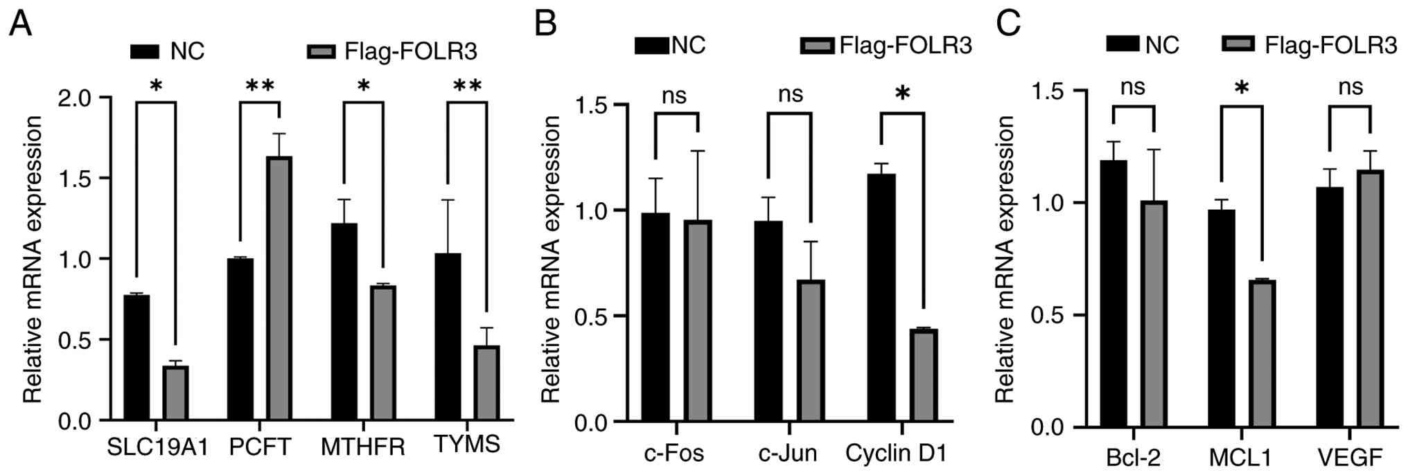 Total RNA was extracted from Flag-FOLR3 and NC groups using the RNAprep pure cell kit (Tiangen Biotech Co., Ltd.) and reverse transcribed into cDNA with the PrimeScript™ RT reagent kit (Takara Bio, Inc.). RT was performed at 37°C for 15 min, followed by enzyme inactivation at 85°C for 5 sec. RT-qPCR was using the Beyofast SYBR™ Green qPCR mix (Beyotime Biotechnology) on a Fluorescent Quantitative PCR Instrument (Bio-Rad). Thermocycling conditions were as follows: initial denaturation at 95°C for 2 min, followed by 40 cycles of denaturation at 95°C for 15 s and annealing/extension at 60°C for 30 sec. The relative expression level of FOLR3 and folate metabolism-related genes was normalized to that of GAPDH, which served as the reference gene. All primers were designed and synthesized by Beyotime Biotechnology and quantification was performed using the 2−ΔΔCq method (data not shown; Table I) (32). Each experiment was performed three times in duplicate.