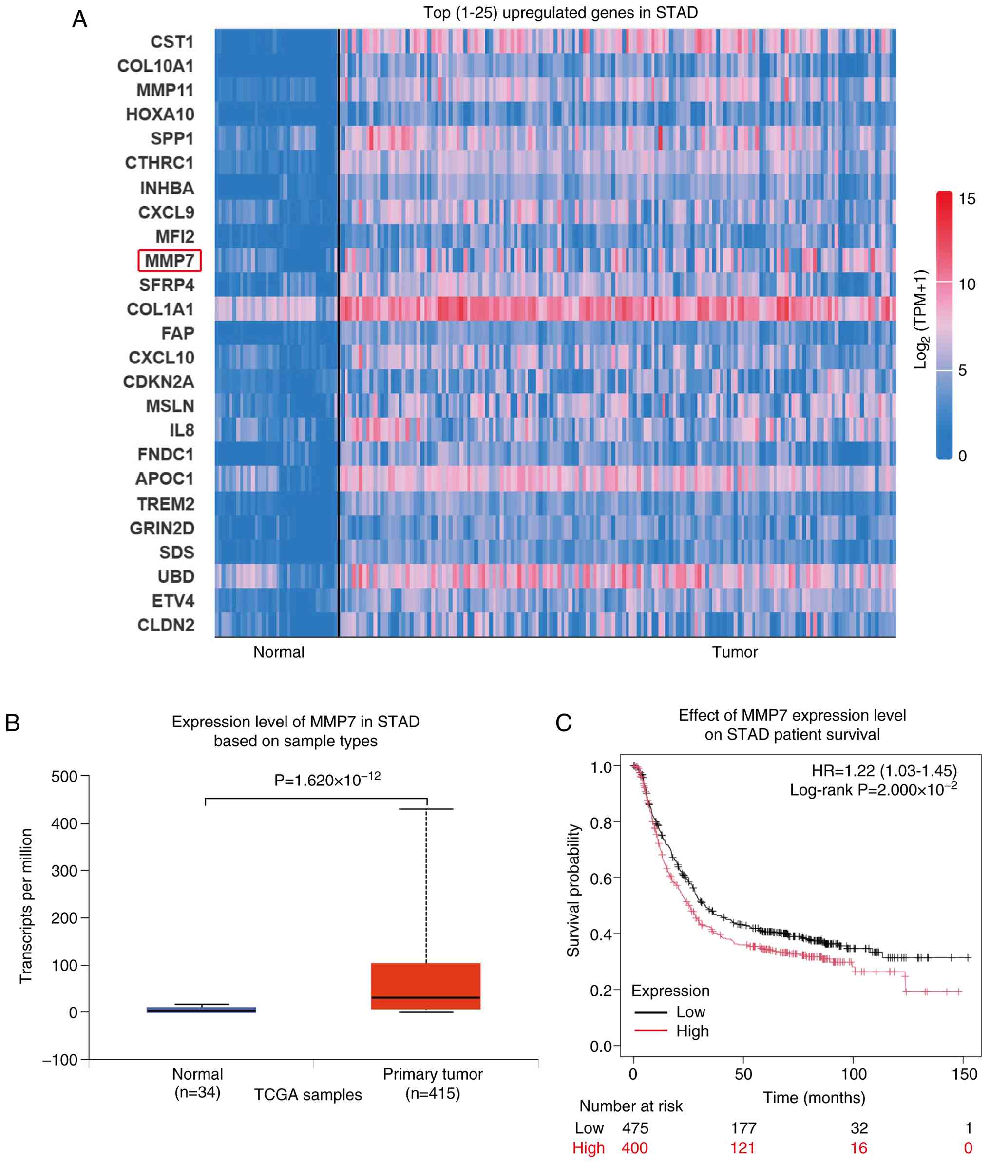 The transcript levels of MMP7 in gastric adenocarcinoma tissue samples (n=415) were significantly higher compared with those in normal tissue samples (n=34; P=1.620×10−12; Fig. 1B). Furthermore, the survival prognosis curve revealed that increased MMP7 expression was significantly associated with unfavorable survival outcomes in patients (Fig. 1C; P=2.000×10−2).