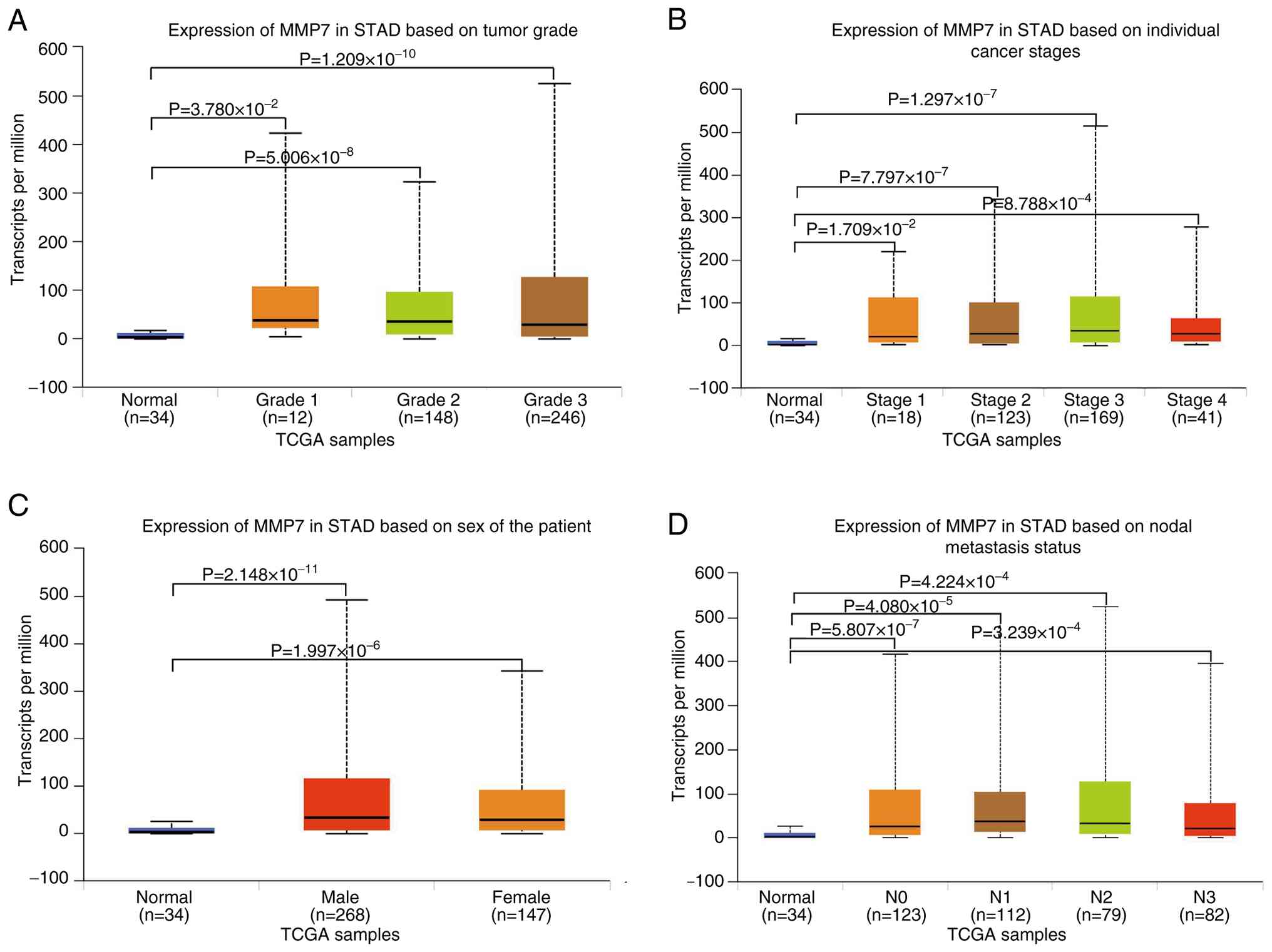 After these analyses, the present study examined the disparities in MMP7 levels in the gastric adenocarcinoma tissues of male and female patients. The results indicated that compared with normal tissues (n=34), MMP7 expression was elevated in both male (n=268, P=2.148×10−11) and female (n=147, P=1.996×10−6) patients, although no notable differences were observed in the expression levels between male and female patients, as shown in Fig. 2C.