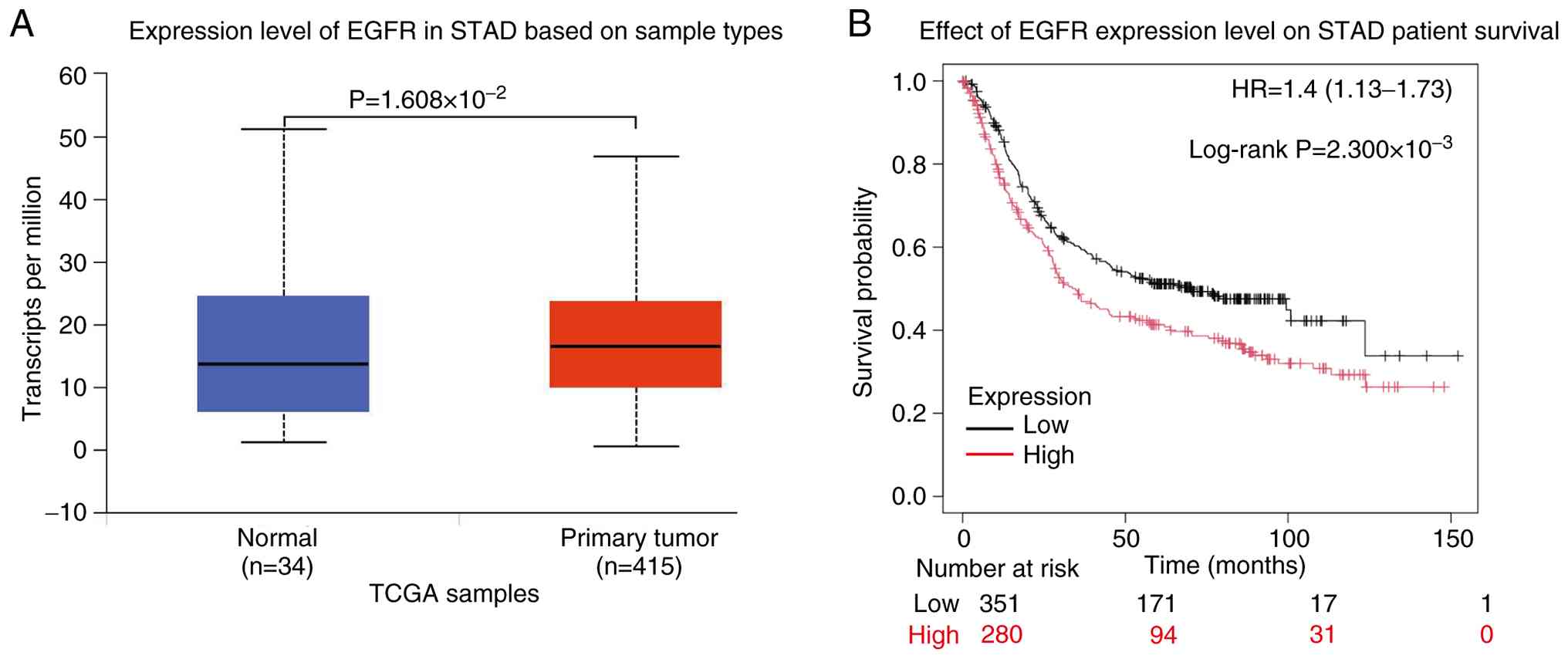 Emerging evidence indicates that MMP7 expression is modulated by upstream regulatory pathways (38,39). Notably, EGFR-mediated regulation of MMP7 has been reported not only in diabetic kidney disease (40), but also in the context of GC metastasis (41), suggesting a potentially conserved mechanism across inflammatory and malignant conditions. The present bioinformatic analysis of TCGA dataset revealed significant differential expression level of EGFR between normal gastric tissue and gastric adenocarcinoma, with notable upregulation observed in malignant tissues (P=1.608×10−2; Fig. 3A). Survival analysis demonstrated that elevated EGFR expression is significantly associated with worse clinical outcomes in patients with gastric adenocarcinoma (P=2.300×10−3; Fig. 3B), highlighting its prognostic relevance in GC progression.