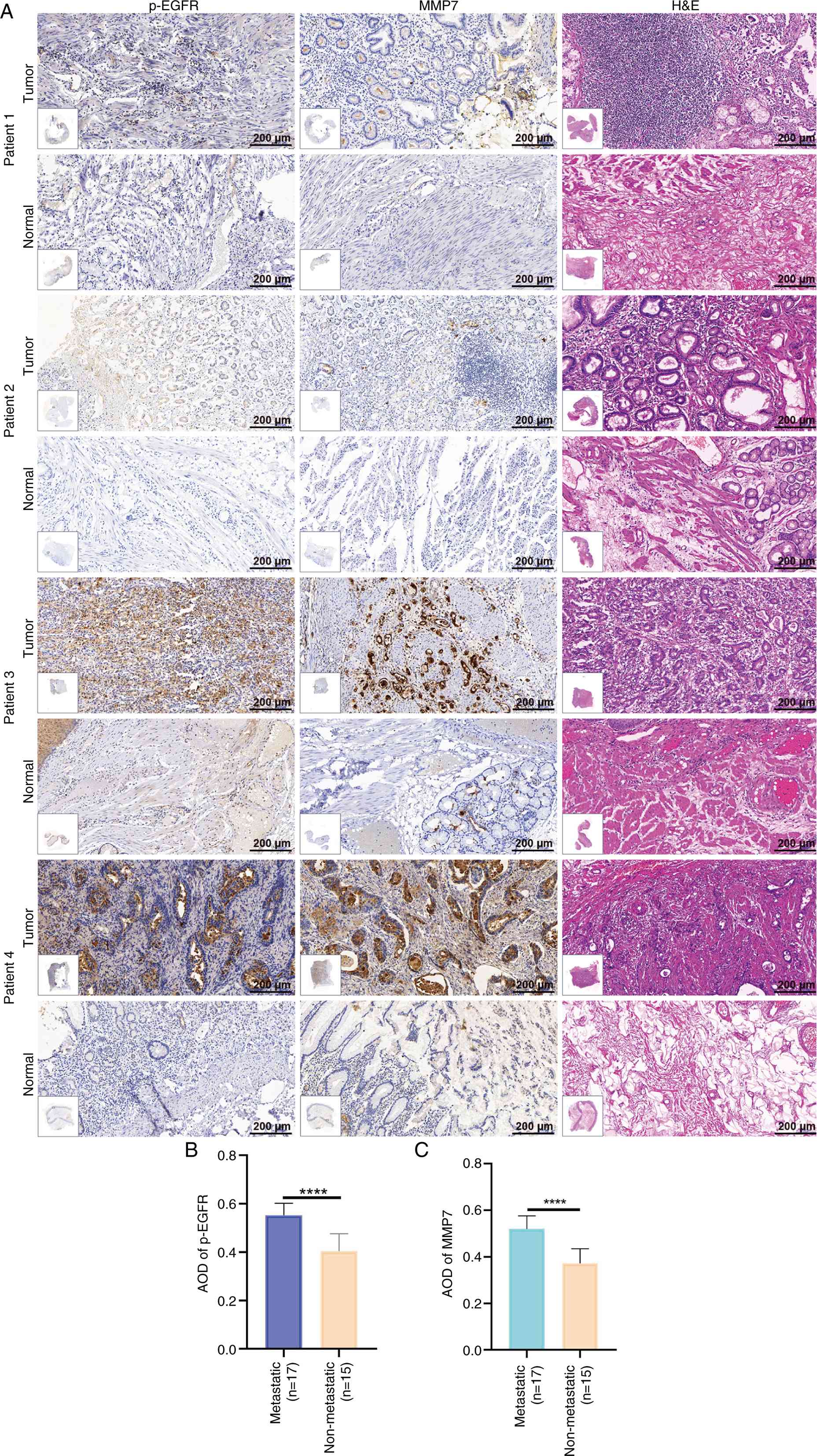 The present study utilized 32 matched pairs of gastric adenocarcinoma and adjacent normal tissue samples, including 17 metastatic and 15 non-metastatic cases. All specimens underwent comprehensive histological evaluation using H&E staining, coupled with IHC analysis of p-EGFR and MMP7 expression. Fig. 4A displays representative IHC results from 2 non-metastatic (patients 1 and 2) and 2 metastatic (patients 3 and 4) cases.