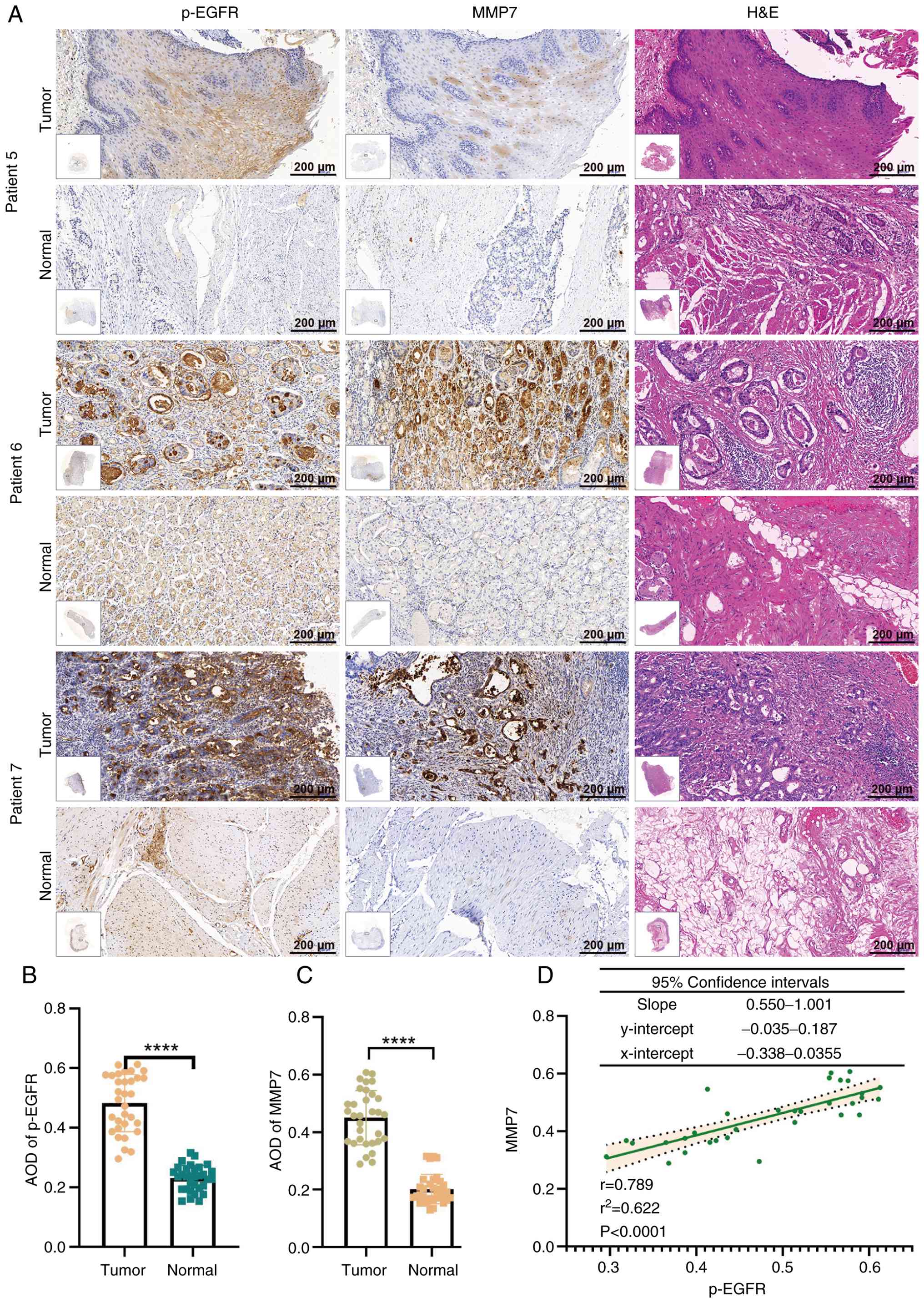 IHC analysis of 17 metastatic GC cases revealed differential MMP7 expression levels, ranging from low (patient 5), moderate (patient 6) to high (patient 7) staining intensity (Fig. 5A). Comparative evaluation of all 32 matched tumor-normal tissue pairs demonstrated significantly elevated expression levels of both p-EGFR (P<0.0001) and MMP7 (P<0.0001) in gastric adenocarcinoma tissues compared with that in their normal counterparts (Fig. 5B and C).