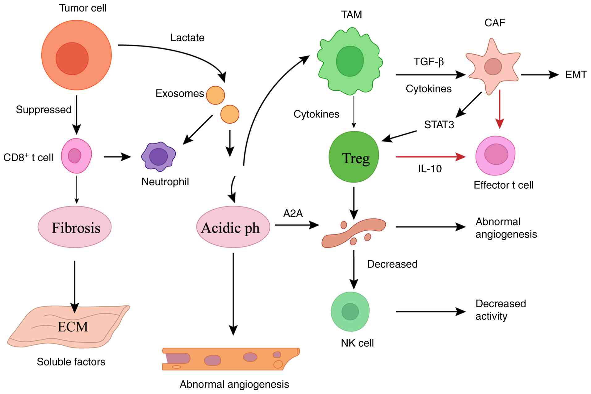 Soluble factors including cytokines, chemokines, growth factors and metabolites, collectively drive GC progression and immune evasion by modulating immune cell function, promoting tumor growth and metastasis and remodeling the stromal compartment. Among these, IL-6 and TGF-β are key immunosuppressive cytokines. IL-6 activates the JAK/STAT3 pathway to promote tumor cell proliferation and survival while inhibiting CD8+ T-cell function (45). TGF-β exacerbates immunosuppression by inducing Treg differentiation and suppressing effector T-cell activity (46).