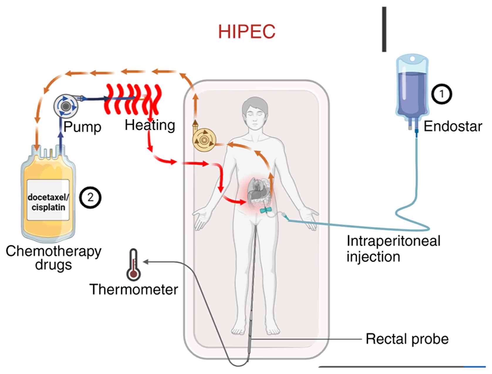 Abdominal circumference was measured in all patients before and after treatment. The treatment protocol is outlined in Fig. 1. First, the volume of ascites was assessed via abdominal ultrasonography. Under ultrasound guidance, a single-lumen central venous catheter or an external drainage catheter (6F or 8F) was percutaneously inserted into the abdominal cavity for continuous drainage. Ascites was drained slowly over 1–3 days with the flow regulated not to exceed 1,000 ml/h to prevent complications. Endostar was administered by intraperitoneal injection on days 1, 4 and 7 of the treatment cycle. On day 4, HIPEC was performed immediately following the Endostar injection. The chemotherapeutic agent (docetaxel or cisplatin) was prepared in a perfusion solution, which was then circulated through a closed-loop system equipped with a pump and a heating module. The solution was heated to the target therapeutic temperature (42–43°C) and infused into the abdominal cavity; it was maintained in circulation for the prescribed duration to allow for continuous hyperthermic perfusion of the peritoneal surface, before being returned to the system for reheating and recirculation. Core body temperature was monitored in real-time throughout the HIPEC procedure using a rectal temperature probe. Ascites drainage statistics were collected. HIPEC was administered using a thermochemotherapy perfusion device (RHL-2000A; Jilin Maida Medical Device Co., Ltd.) with careful temperature control of the body between 43 and 45°C. Prior to chemotherapeutic drug infusion, the abdominal cavity was effectively rinsed with 1,000-2,000 ml of warm normal saline.