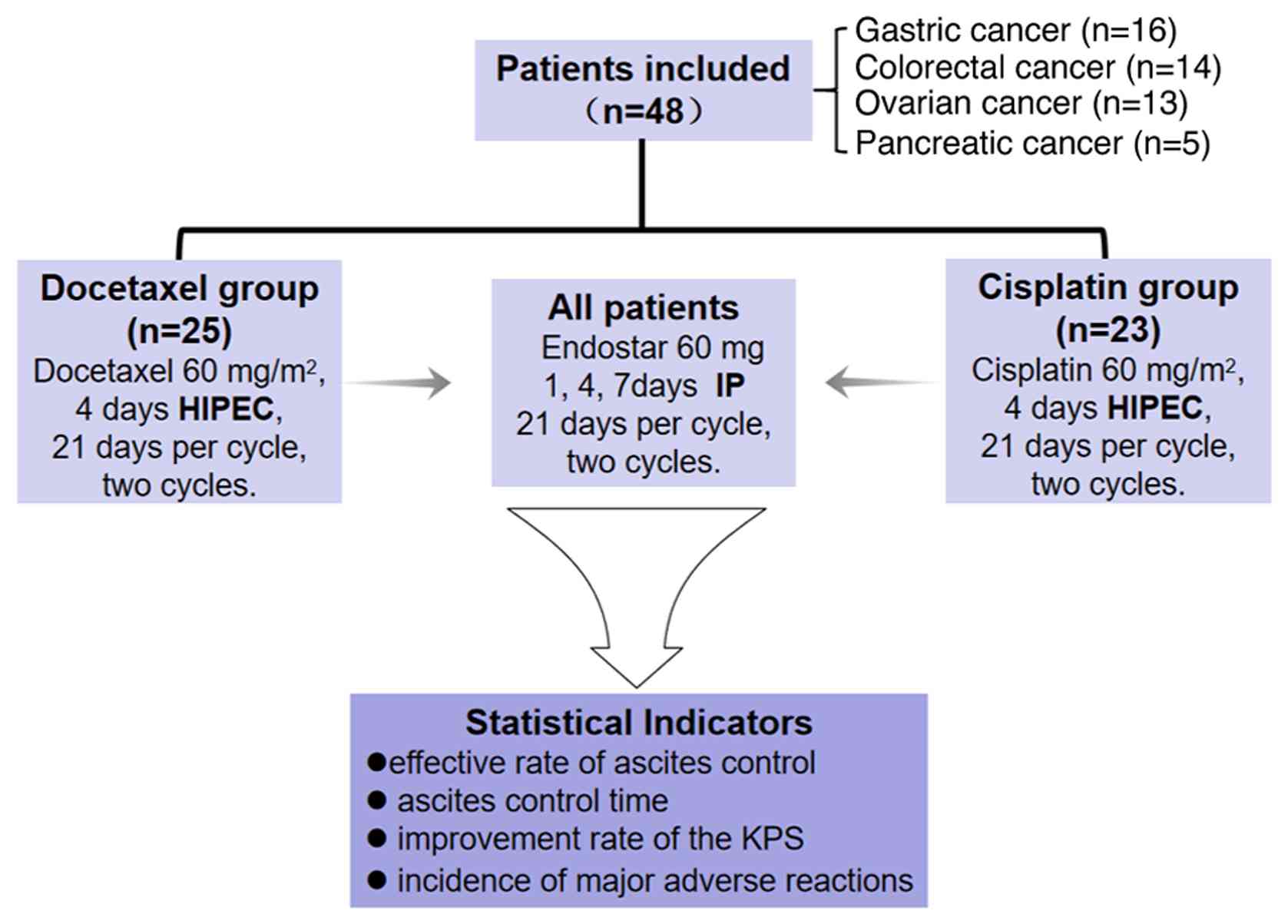 The present retrospective study involved patients treated between July 2019 and December 2020 at the Sandun Campus of Zhejiang Hospital (Hangzhou, China). The eligibility criteria were as follows: i) Patients must have been diagnosed with a malignant tumor, with evidence of cytology or tumor cells in an ascites cell block; ii) patients must have previously undergone systemic chemotherapy of second line or higher, and not undergone a HIPEC procedure in the past 6 months; iii) patients must not have received docetaxel, cisplatin or Endostar before receiving the protocol under investigation; iv) hemoglobin level must be ≥90 g/l (normal range, 120–160 g/l for women and 130–170 g/l for men); v) absolute neutrophil count must be ≥1.5×109/l (normal range, 1.8–7.7×109/l); vi) white blood cell count must be >3.5×109/l (normal range, 4.0–10.0×109/l); vii) platelet count must be ≥85×109/l (normal range, 150–400×109/l); viii) total bilirubin must be ≤1.5 times the upper limit of normal (ULN) (normal range, 3.4–20.5 µmol/l or 0.2–1.2 mg/dl); ix) aspartate aminotransferase and alanine aminotransferase must both be ≤2.5 times the ULN (normal range for AST, 8–40 U/l; normal range for ALT, 7–56 U/l); x) patients must have an expected survival time of >3 months; and xi) patients should have failed at least two rounds of systemic chemotherapy regimens. The exclusion criteria were: i) Uncontrolled central nervous system metastases with manifestations of intracranial hypertension; ii) bleeding tendency, especially marked gastrointestinal bleeding within the past 4 weeks, or currently undergoing thrombolytic or anticoagulant therapy; iii) prior IP infusion of docetaxel, cisplatin or Endostar within 6 months, or concurrent participation in other clinical studies; iv) myocardial infarction within the past 6 months, or current unstable angina pectoris or cardiac insufficiency; v) severe chronic obstructive pulmonary disease and/or respiratory failure, or severe intestinal adhesions; vi) currently uncontrolled severe infection; vii) known allergy to the investigational drug(s) or their excipients; viii) fertile patients unwilling to adopt contraception, and pregnant or lactating women; ix) poor compliance or diagnosed with significant psychiatric disorders causing lack of self-control.