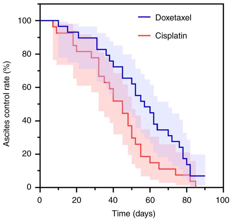 The median ascites control time was 55 days (95% CI: 46.892–63.108) in the docetaxel group and 46 days (95% CI: 34.261–57.739) in the cisplatin group. When comparing the control time between the two groups, the difference was not statistically significant (log-rank χ2=0.934; P=0.334) (Fig. 3).